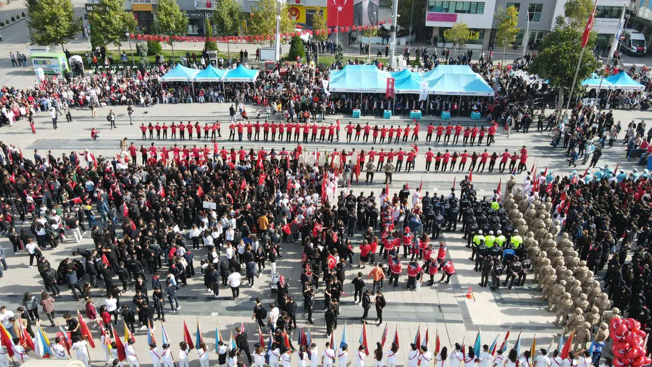 KADEŞ Meydanı’nda gerçekleştirilen 29 Ekim kutlamalarına vatandaşlar yoğun ilgi gösterdi. Kutlamalarda aralarında esnaflar, kamu çalışanları, öğrenciler ve vatandaşların da bulunduğu 100 kişi Çorum halayı çekti. Renkli görüntülere sahne olan gösteri beğeni topladı. Büyük bir coşkunun hakim olduğu kutlamalar havadan da görüntülendi. (Zahide Yasemin Özden)
