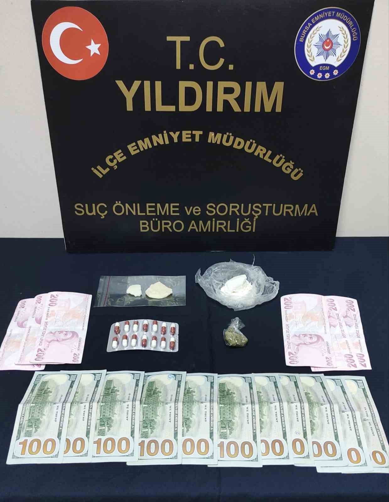 Yıldırım Suç Önleme ve Soruşturma Büro Amirliği ekiplerince uyuşturucu madde ticaretine yönelik operasyon yaptı. Operasyon çerçevesinde 3 gündür takip edilen şahıs, Yıldırım ilçesi Meydancık Mahallesi İncirli Caddesi üzerinde Yıldırım SÖS ekipleri tarafından kıskıvrak yakalandı. Ekipler, şahsın üzerinde 27,5 gram toz kokain, 12,70 gram taş kokain, 14 adet uyuşturucu etkili yeşil reçeteye tabi ‘Gerica’ ibareli ilaç ve 2 gram esrar ele geçirdi. Öte yandan, uyuşturucu madde satışından kazanıldığı değerlendirilen bin 100 dolar ve bin 655 lira ele geçirildi. Yakalanan şahıs, ifadesinin ardından adliyeye sevk edildi.