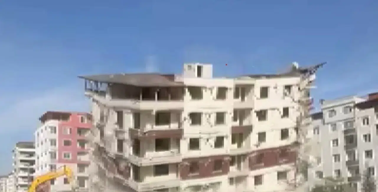 Kahramanmaraş merkezli depremlerde ağır hasar alan Hatay’da mahkeme süreci sona eren binaların yıkım ve enkaz kaldırma çalışmaları aralıksız sürüyor. Defne ilçesi Çekmece Mahallesi’nde bulunan 7 katlı bina, iş makinesi ile kontrollü olarak yıkıldı. Binanın yıkılma anı ise kameralara saniye saniye yansıdı. 7 katlı binanın yıkımı esnasında herhangi bir olumsuzluk yaşanmadı.