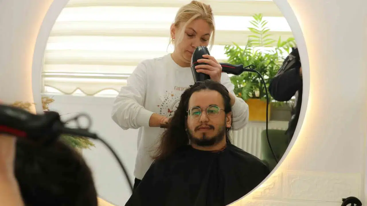 25 yıllık kadın kuaförü Tülay Aytaş, “Saçlarını bağışlayacağını duyunca çok sevindim. İlk defa bir erkeğin saçlarını kesiyorum” şeklinde konuştu.