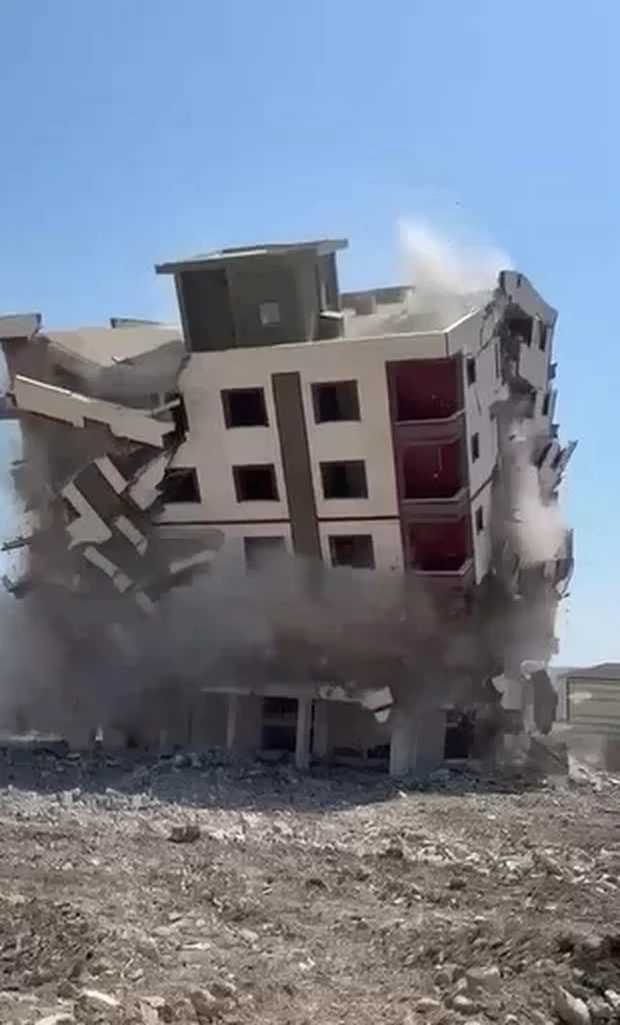 Hatay’ın Antakya ilçesinde 8 katlı binanın iş makinesinin dokunuşuyla kontrollü olarak yerle bir olduğu anlar kameraya yansıdı.