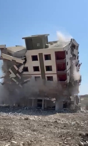 Kahramanmaraş merkezli depremlerde ağır hasar alan Hatay’da mahkeme süreci sona eren binaların yıkım ve enkaz kaldırma çalışmaları aralıksız sürüyor. Antakya ilçesi Küçükdalyan Mahallesi’nde bulunan 8 katlı bina, iş makinesinin dokunuşuyla kontrollü olarak yıkıldı. Binanın yıkılma anı ise kameralara saniye saniye yansıdı. 8 katlı binanın yıkımı esnasında herhangi bir olumsuzluk yaşanmadı.