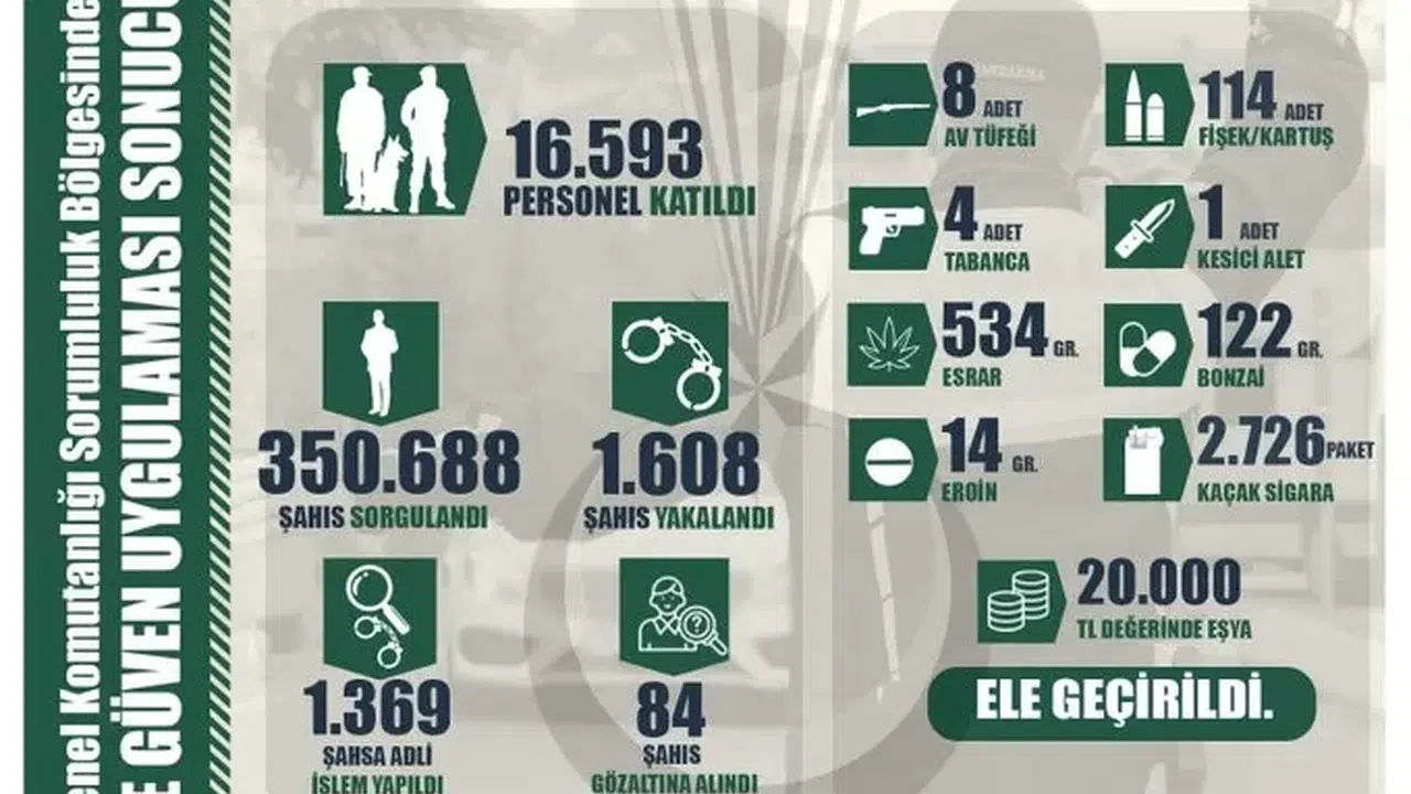 Jandarma Genel Komutanlığı sosyal medya hesabından yaptığı paylaşımla, kendi sorumluluk bölgelerinde gerçekleştirdiği huzur ve güven operasyonlarında yakalanan şahısları ve ele geçirilen maddeleri açıkladı. Paylaşılan bilgilere göre 16 bin 593 personelin katıldığı operasyonlarda, 350 bin 688 şahıs sorgulandığı, bin 608 şahısın ise yakalandığı ifade edildi. Yakalanan şahıslardan bin 369’una adli işlem yapılırken 84 şahısın ise göz altına alındığı bilgisi verildi.