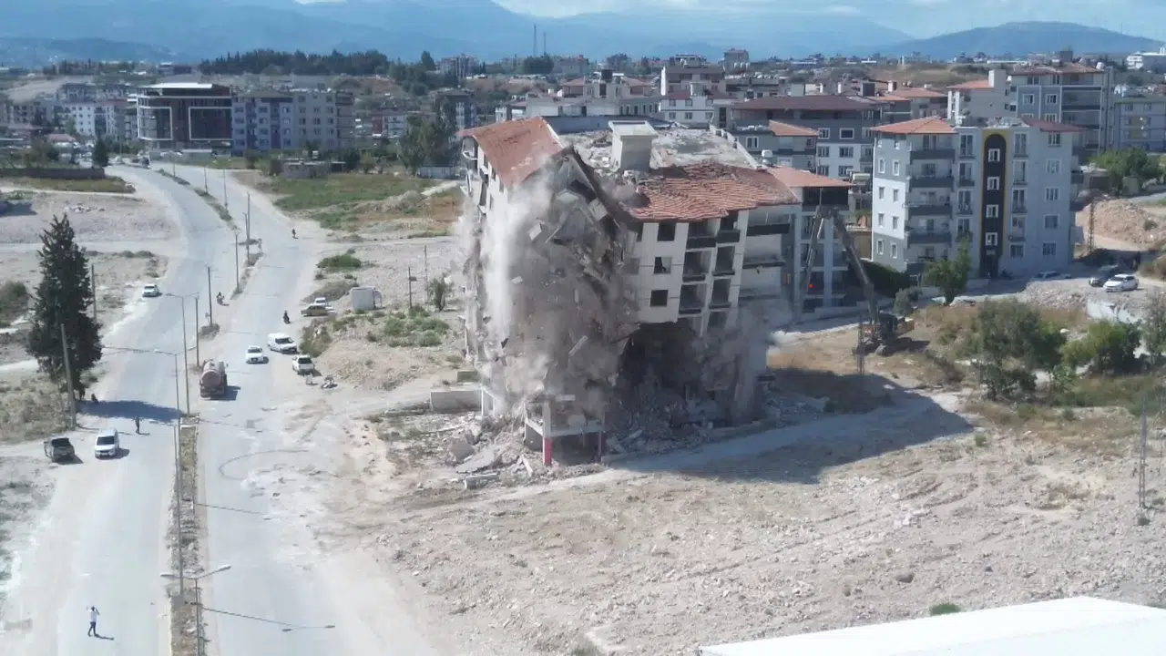 Kahramanmaraş merkezli depremlerde ağır hasar alan Hatay’da mahkeme süreci sona eren binaların yıkım ve enkaz kaldırma çalışmaları aralıksız sürüyor. Antakya ilçesi Esentepe Mahallesi’nde bulunan 9 katlı bina, iş makinesiyle kontrollü olarak yıkıldı. 9 katlı binanın yıkımı esnasında herhangi bir olumsuzluk yaşanmazken binanın yıkımı havadan dronla görüntülendi.