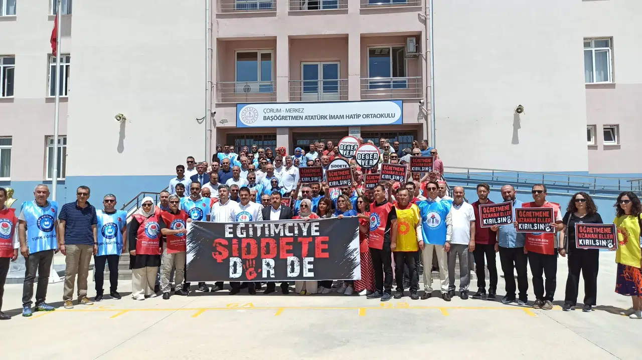 Çorum’da eğitimci çalışanları, Başöğretmen Atatürk İmam Hatip Ortaokulu’nda toplandı. Okul müdürü ve hizmetlinin darp edilmesine tepki gösteren eğitim çalışanları, hükümete “düzenleme” çağrısı yaptı.