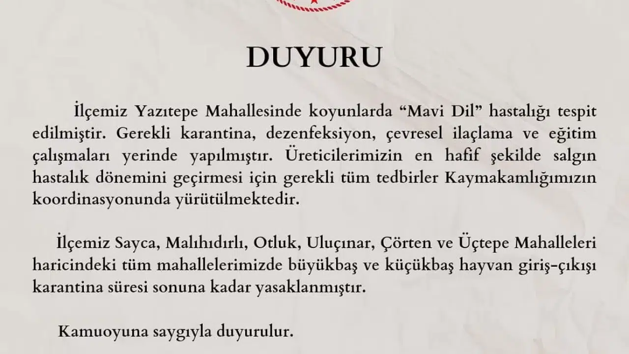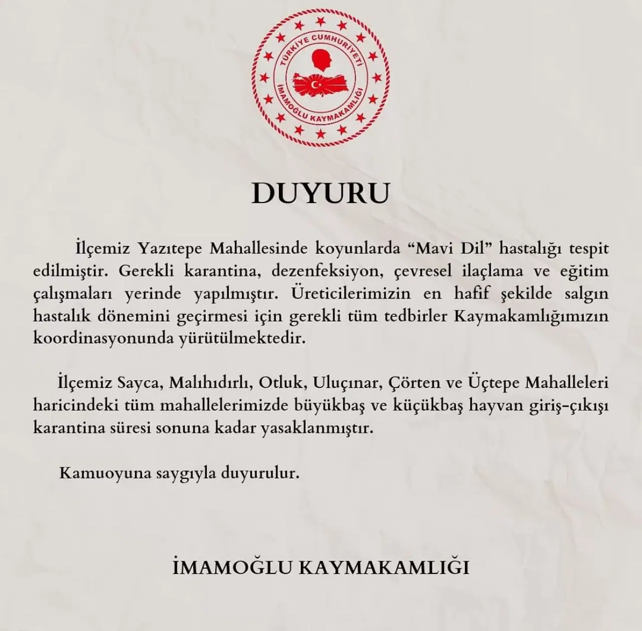 İmamoğlu Kaymakamlığı tarafından yapılan açıklamada, "Yazıtepe Mahallesi, hayvanlarda görülen mavi dil hastalığı nedeni ile karantina kararı alındı. Yazıtepe Mahallesi yakınında bulunan mahallelere karantina boyunca hayvan giriş çıkışları yasaklandı. Mahallede dezenfeksiyon, çevresel ilaçlama ve gerekli eğitim çalışmaları yapıldı” denildi.