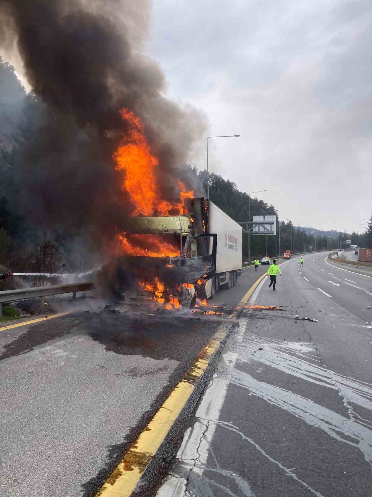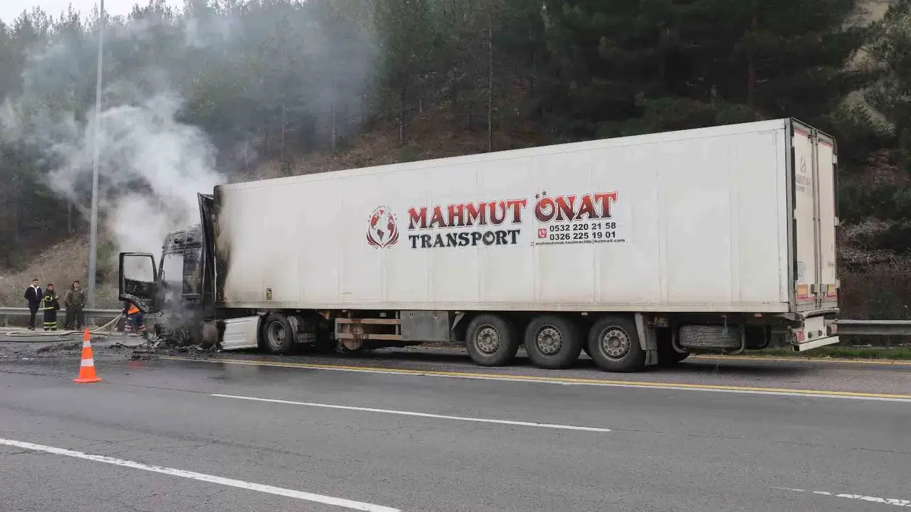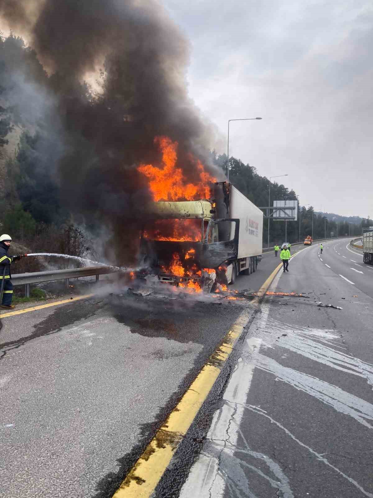 Adana – Pozantı otoyolunda seyir halindeki mandalina yüklü Mercedes Axor marka tırda yangın çıktı. Alevler aracın kupa kısmını tamamen sardı. Tır, kullanılamaz hale geldi.