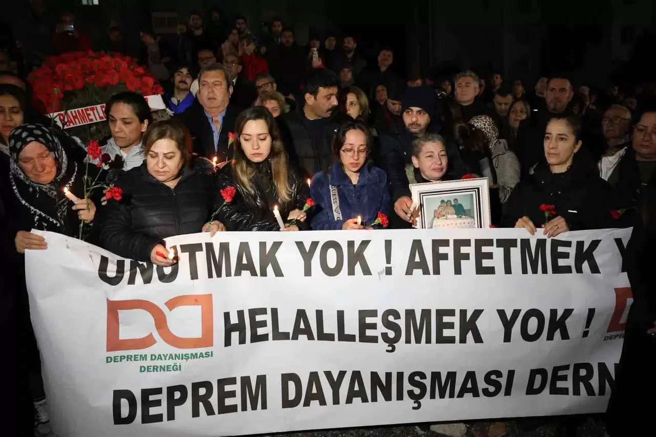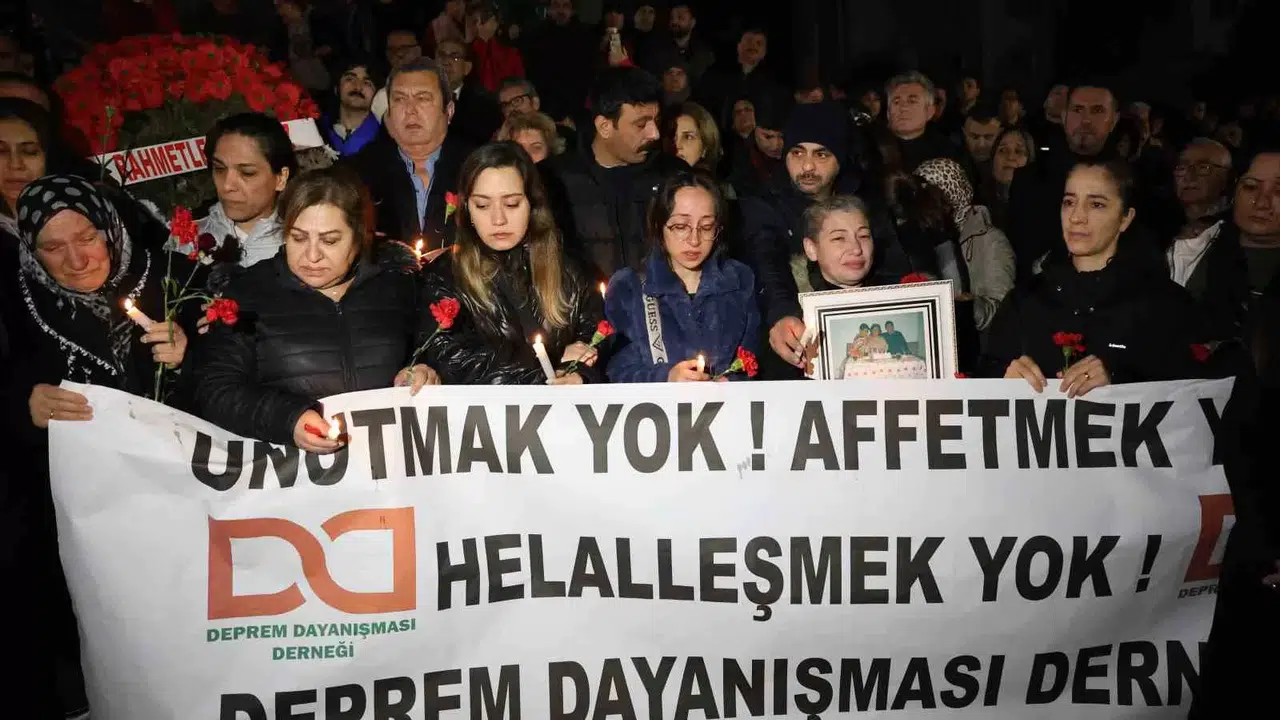 Kahramanmaraş merkezli 7.7 ve 7.6 şiddetindeki depremlerde Adana’da 13 apartman yıkılmıştı. Depremin yıl dönümünde yıkılan apartmanların arsasında ölenlerin yakınları depremin yaşandığı saatte bir araya gelerek yakınlarını andı.