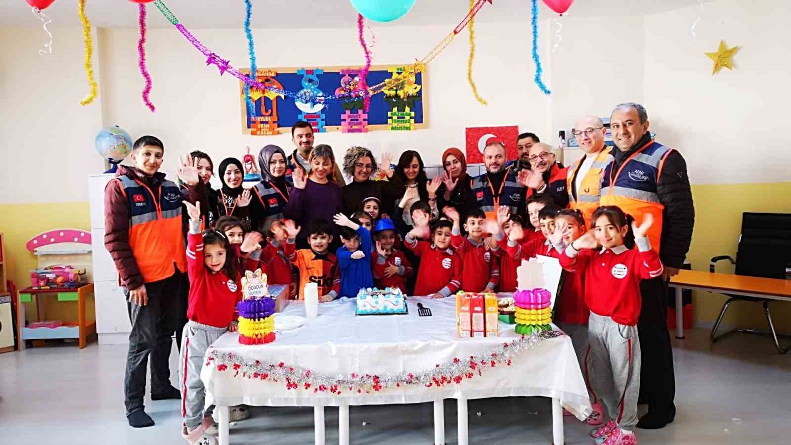Afet ve Acil Durum Yönetimi Başkanlığı (AFAD) Erzurum Gönüllüleri, Nene Hatun Anaokulu’nda duygu dolu ve örnek bir davranışa imza attı. Toplumda afetlere hazırlık ve gönüllülük bilincinin yaygınlaştırılmasına katkıda bulunmak için ortaya çıkan AFAD Gönüllüleri, sadece afet zamanlarında değil her daim gönüllü hareket ettiklerini bir kez daha gösterdiler. Depremden dolayı ailesi ile birlikte Erzurum’a gelmek zorunda kalan ve buraya yerleşen bir ailenin beş yaşındaki çocuğu olan Yiğit Buğra Özer’e doğum günü kutlaması yapan AFAD Gönüllüleri, hep birlikte pasta kestiler ve Yiğit Buğra’ya güzel anlar yaşattı. AFAD Gönüllüleri’nden birçoğu Kahramanmaraş depremi sonrasında bölgede arama-kurtarma çalışmalarında aktif olarak görev aldı. Anne Fidan Özer, AFAD Gönüllüleri’nin yaptığı bu güzel davranıştan dolayı teşekkür ederken zaman zaman gözyaşlarına engel olamadı. Doğum günü kutlamasının sonunda AFAD Gönüllüleri, minik Yiğit Buğra’ya hediye verdi.