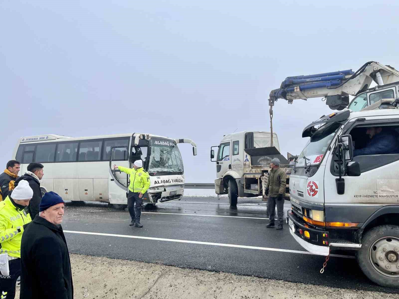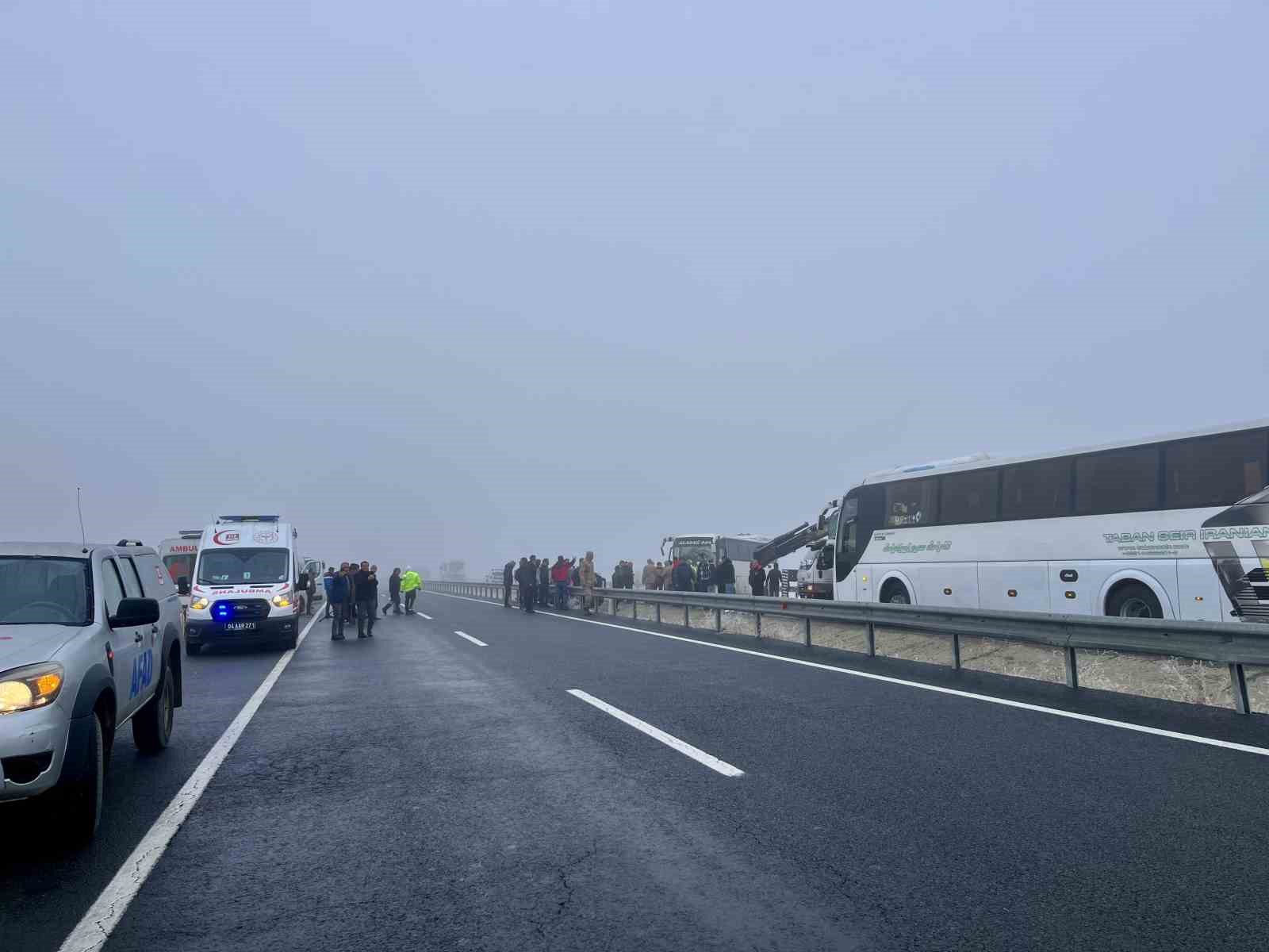 Edinilen bilgilere göre, Ağrı’da sabah saatlerinde etkili olan ve görüş mesafesinin düşmesine neden olan sis nedeniyle Taşlıçay-Ağrı güzergahında zincirleme trafik kazası meydana geldi. Diyadin Belediyesine ait içerisinde yolcu bulunan 3 midibüs, tır, hafif ticari araç, otomobil ve trafik polis aracının karıştığı zincirleme kazada 7 araç birbirine girdi. Kazanın ardından olay yerine jandarma, polis ekipleri ve ambulanslar sevk edildi. Kazada yaralanan 19 kişi Ağrı Eğitim ve Araştırma Hastanesine kaldırılarak tedavi altına alındı.