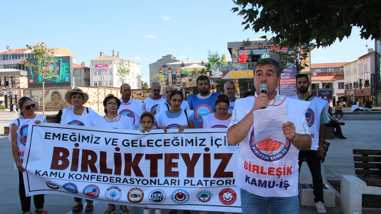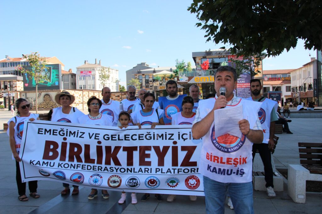 Kamu Konfederasyonları Platformu adına açıklama yapan Birleşik Kamu-İş Çorum İl Temsilcisi Selim Bozkurt, “emeğin onurundan yana taraf olan kamu konfederasyonları olarak gücümüzü ve aklımızı birleştirerek kamu emekçisine sefaleti reva görenlere, bizi ve haklarımızı görmezden gelenlere karşı bugün üretimden gelen gücümüzü kullanarak uyarı amacıyla ülke genelinde 1 günlük iş bırakıyoruz. Memurun ve memur emeklisinin alın terini kimseye heba ettirmeyeceğiz” dedi.