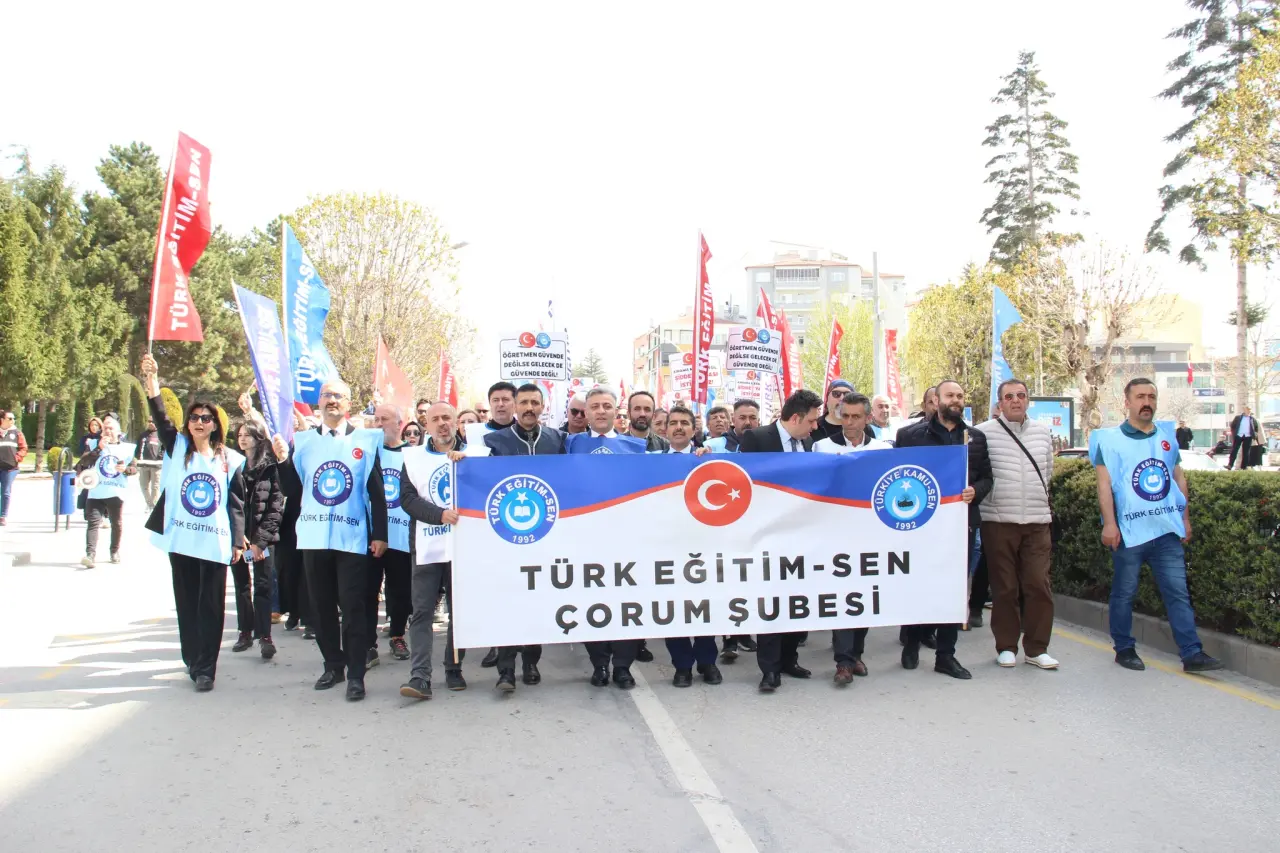 Çorum'da faaliyet gösteren Eğitim-Bir-Sen, Türk Eğitim-Sen, Eğitim-İş, Eğitim-Sen, Eğitim Gücü-Sen, Hürriyetçi Eğitim-Sen ve Anadolu Eğitim Sendikası üyeleri Kadeş Barış Meydanı'nda toplanarak Saat Kulesi'ne kadar sloganlar eşliğinde yürüdü.