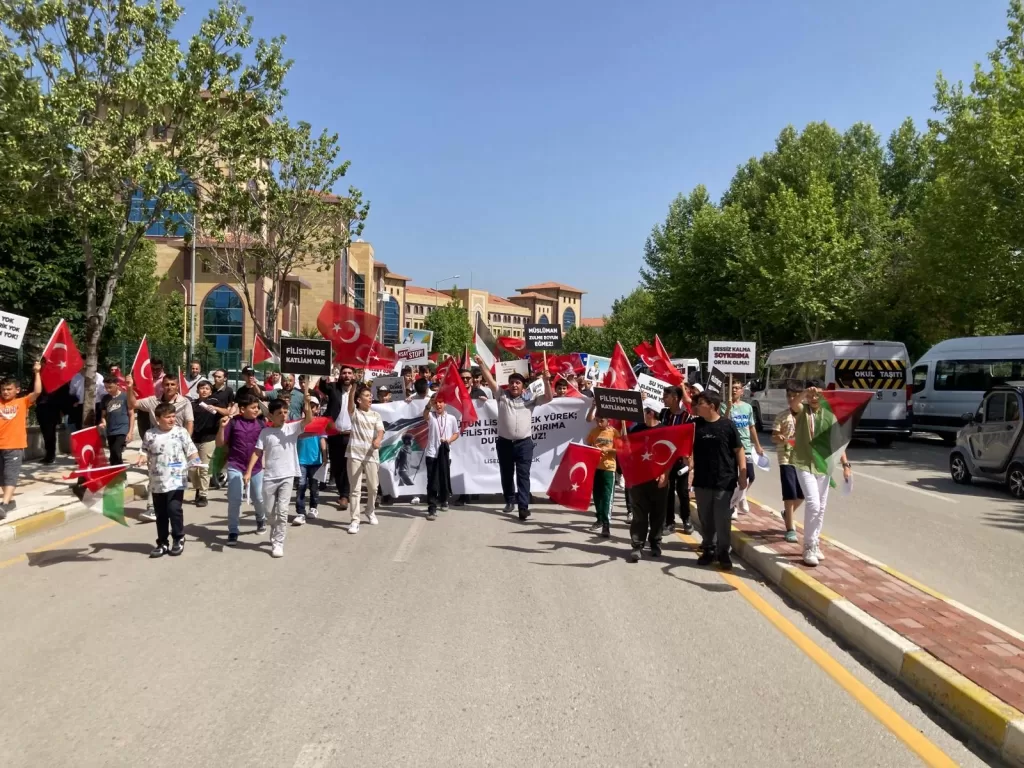 Gençler, dünya liderlerini de eleştirerek, "Dünyanın sözde büyük devletleri insanlık dersinden sınıfta kalmıştır. Bu zulme karşı sessiz kalarak, İsrail'in yanında yer alıyorlar. Bizler, Cumhurbaşkanı Recep Tayyip Erdoğan'ın liderliğinde bu zulme karşı durmaya devam edeceğiz" dedi.