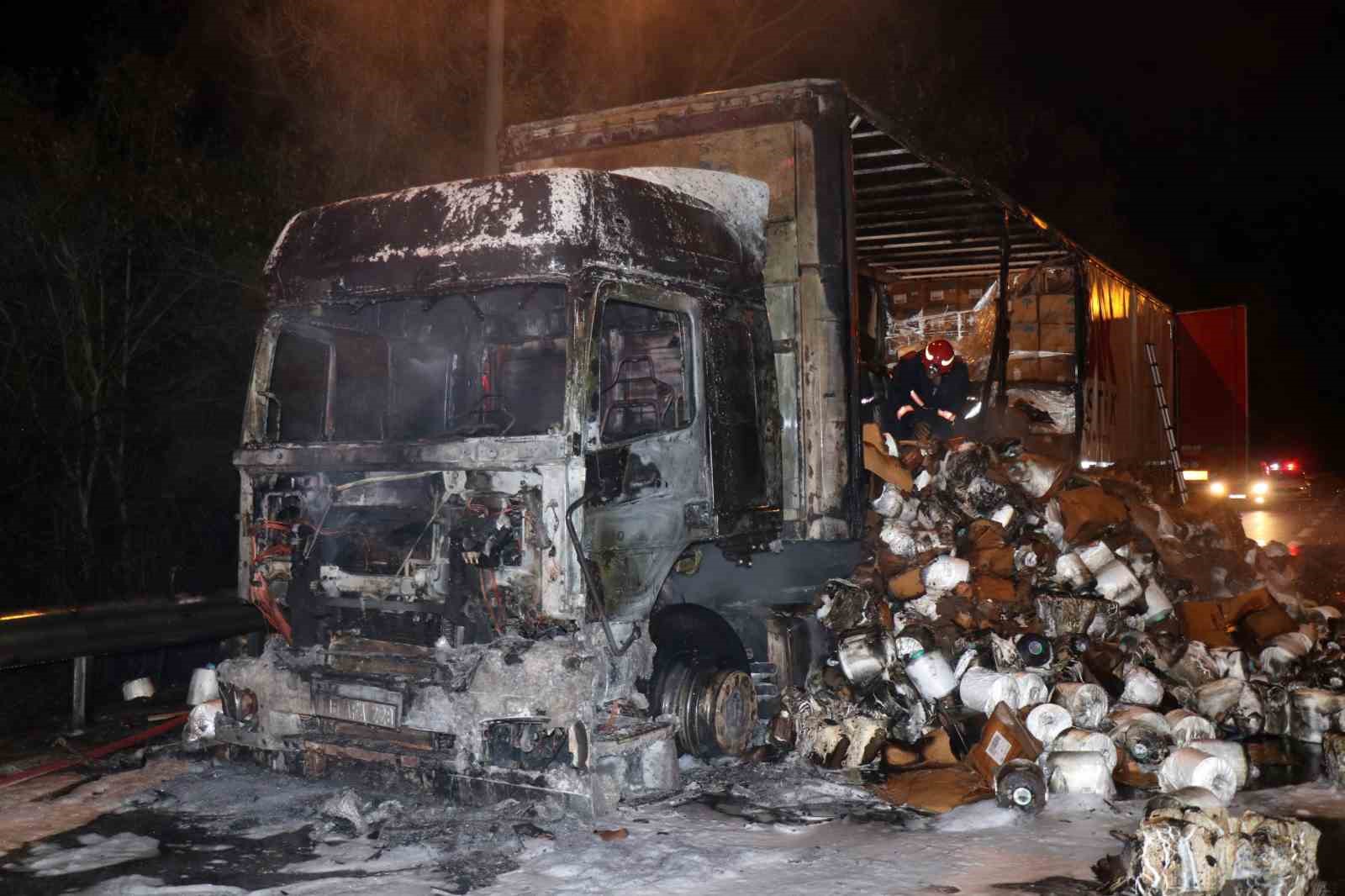 Anadolu Otoyolu’nda Elyaf İplik Yüklü Tır Yanarak Hurdaya Döndü
