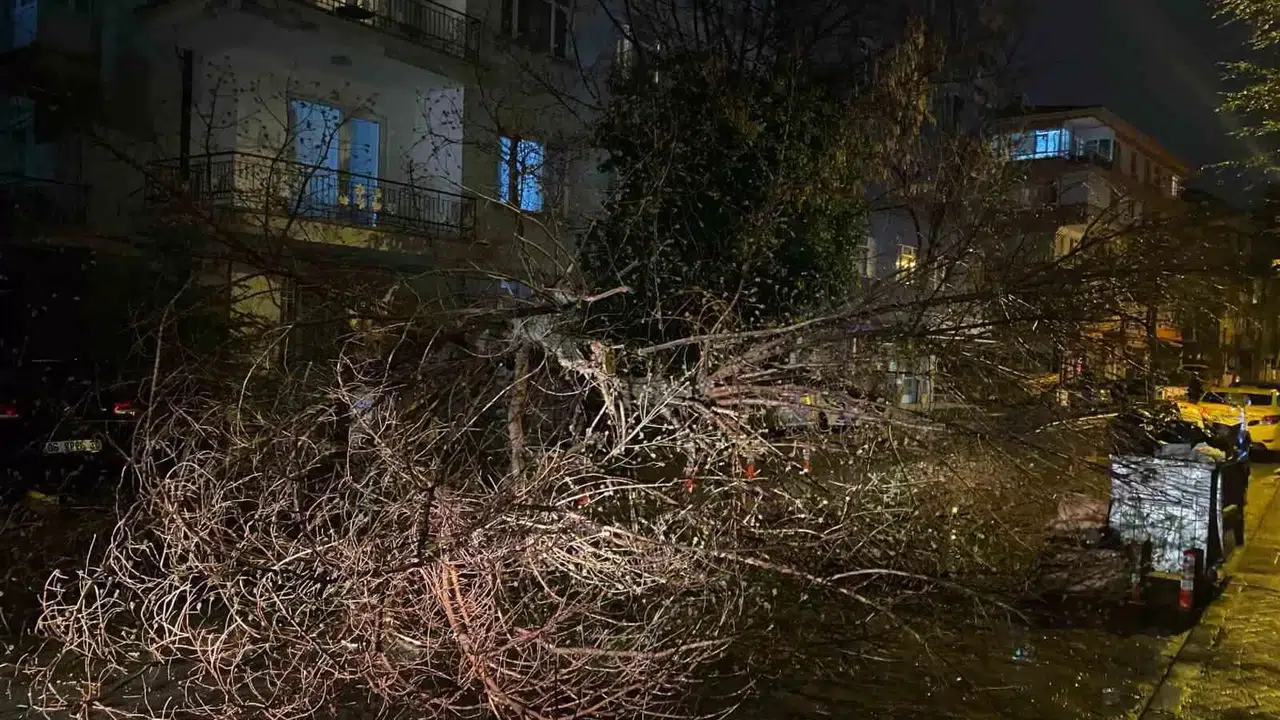 Ankara’da etkili fırtına nedeniyle ağaç devrilirken, sokak geçici olarak trafiğe kapatıldı.