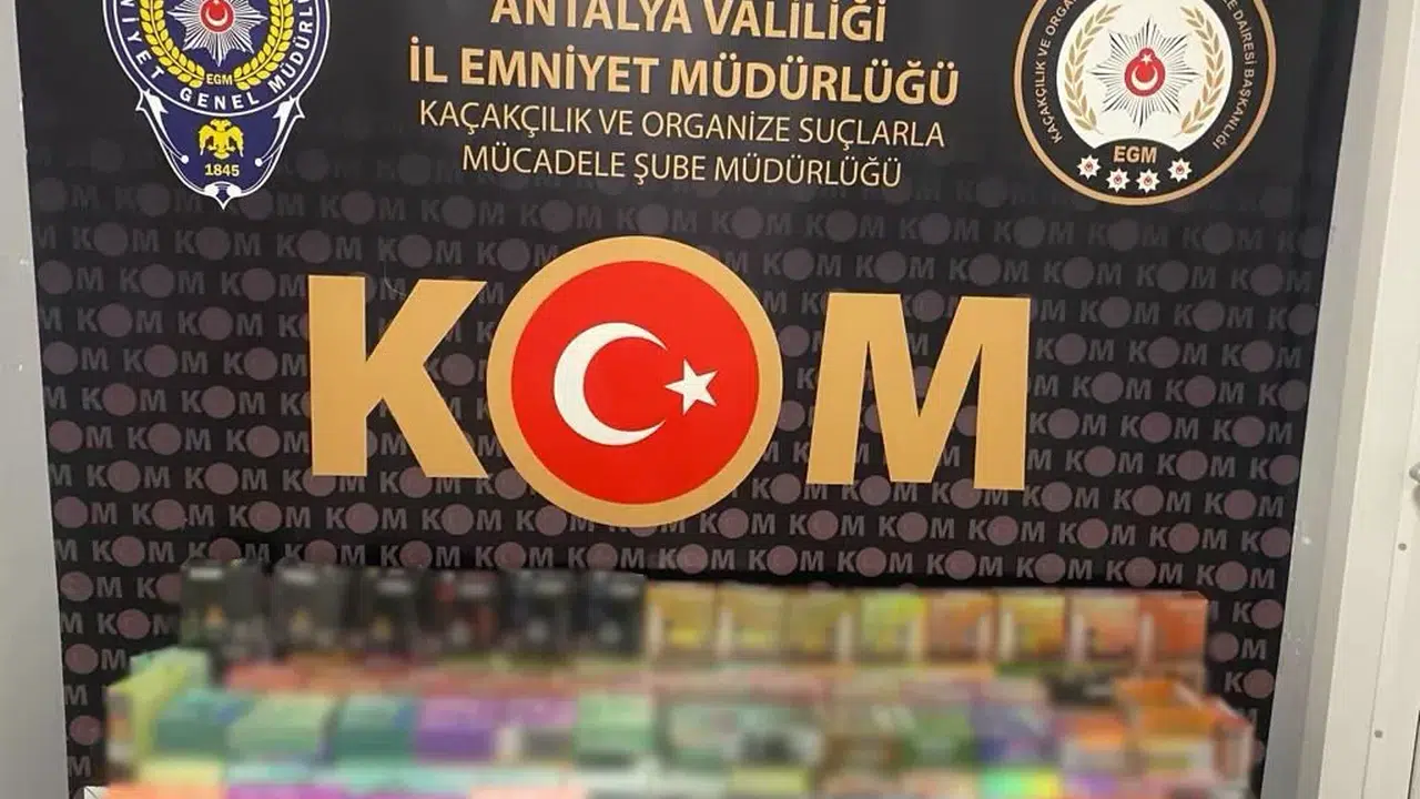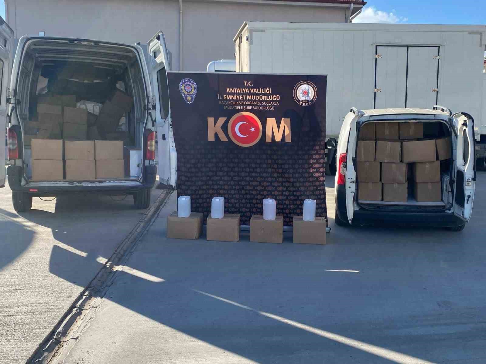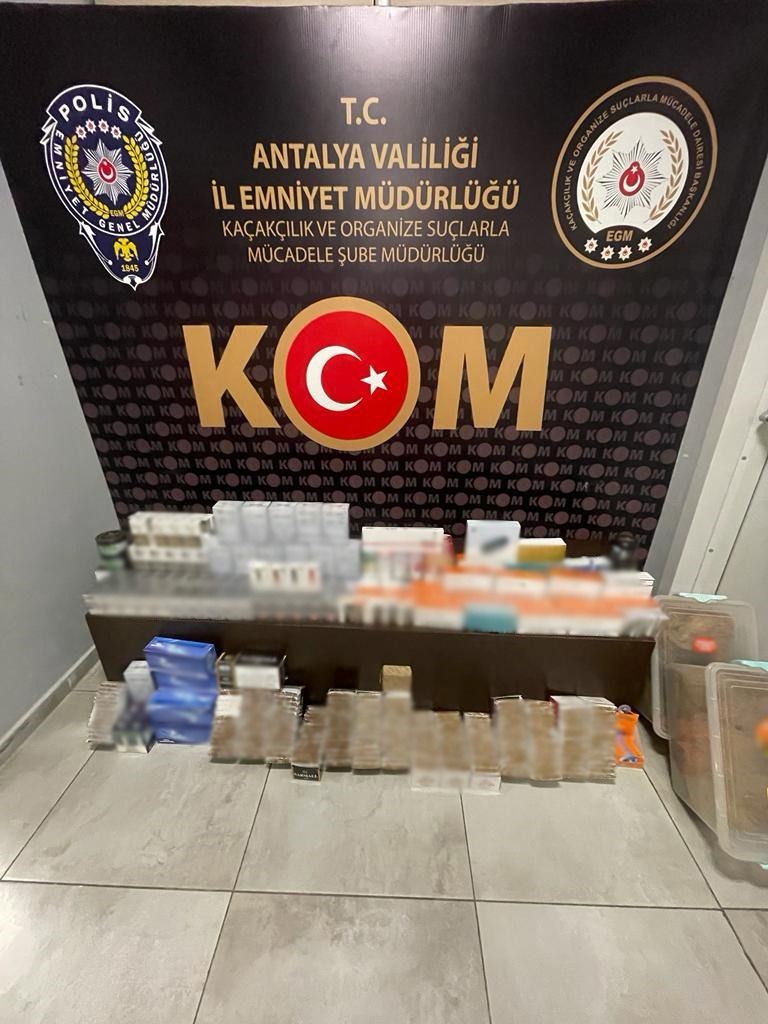 Antalya Emniyet Müdürlüğü Kaçakçılık ve Organize Suçlarla Mücadele Şube Müdürlüğü görevlileri tarafından merkez Muratpaşa, Kepez ve Konyaaltı ilçelerinde yapılan çalışmalarda bin 860 litre sahte alkol, bin 850 paket elektronik sigara kartuşu ve 300 adet sigara likiti, 2 bin 200 adet elektronik sigara, 39 bin adet boş makaron, 2 bin 270 adet puro, 2 bin100 paket gümrük kaçağı sigara, 80 kg kıyılmış tütün, 11 bin 200 paket doldurulmuş sigara ve 56 bin sarma kağıdı, bin kg nargile tütünü, 1 adet sigara basım makinası ve 1 adet kompresör ele geçirildi.