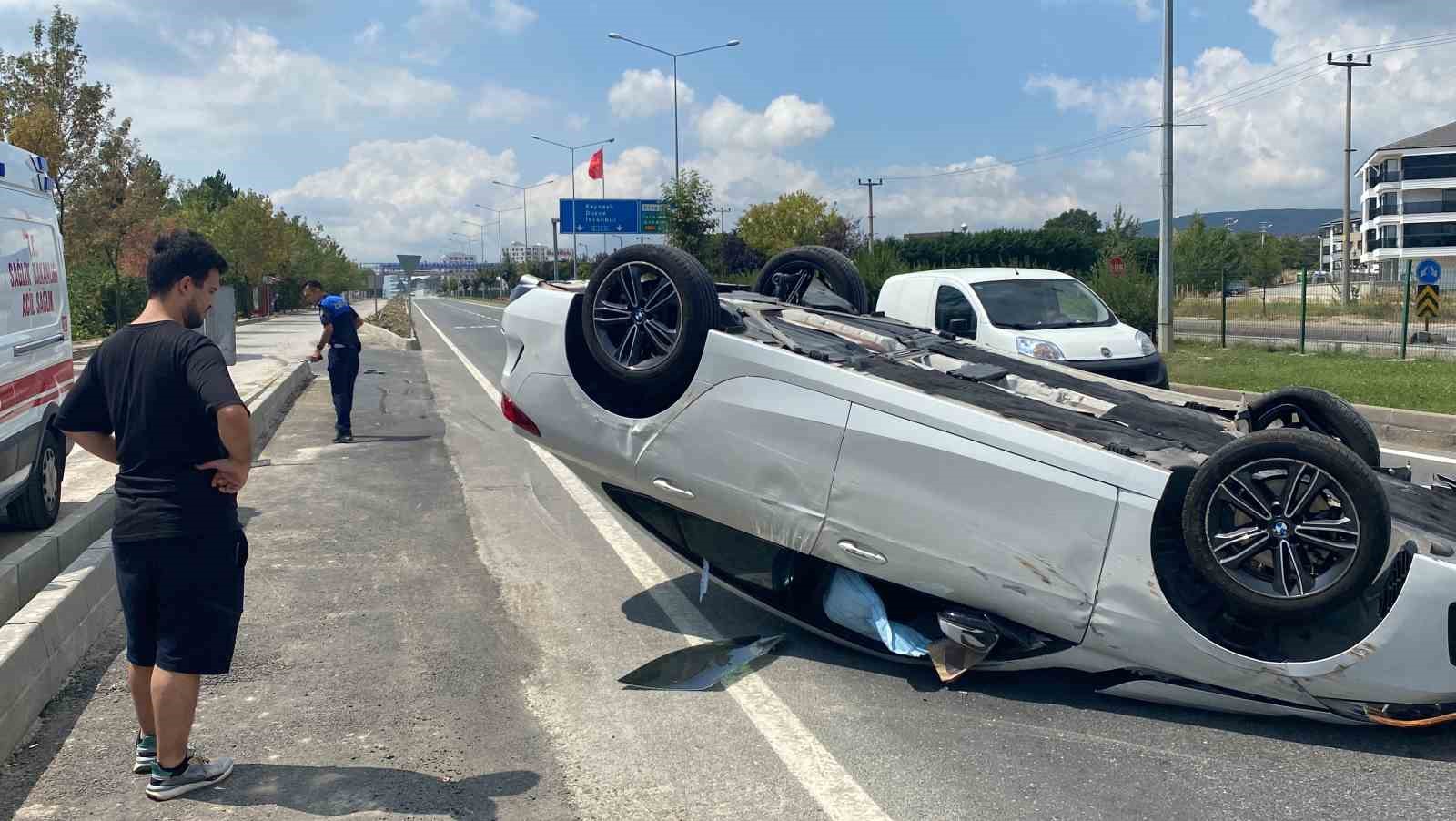 Bolu’da D-100 kara yolunda, kaldırıma çarpan otomobil tepetaklak oldu. Meydana gelen kazada sürücünün burnu bile kanamadı.
