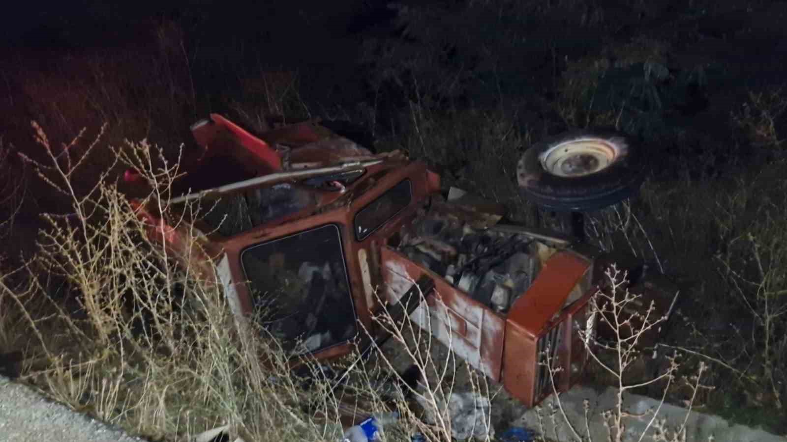 Devrilen traktörün lastiği koptu