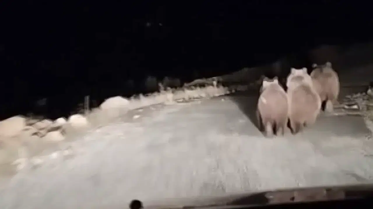 Gece geç saatte köy yolunda otomobilin önünde koşan ayılardan önce ikisi daha sonra ise diğer ayı yoldan çıkarak gözlerden kayboldu.