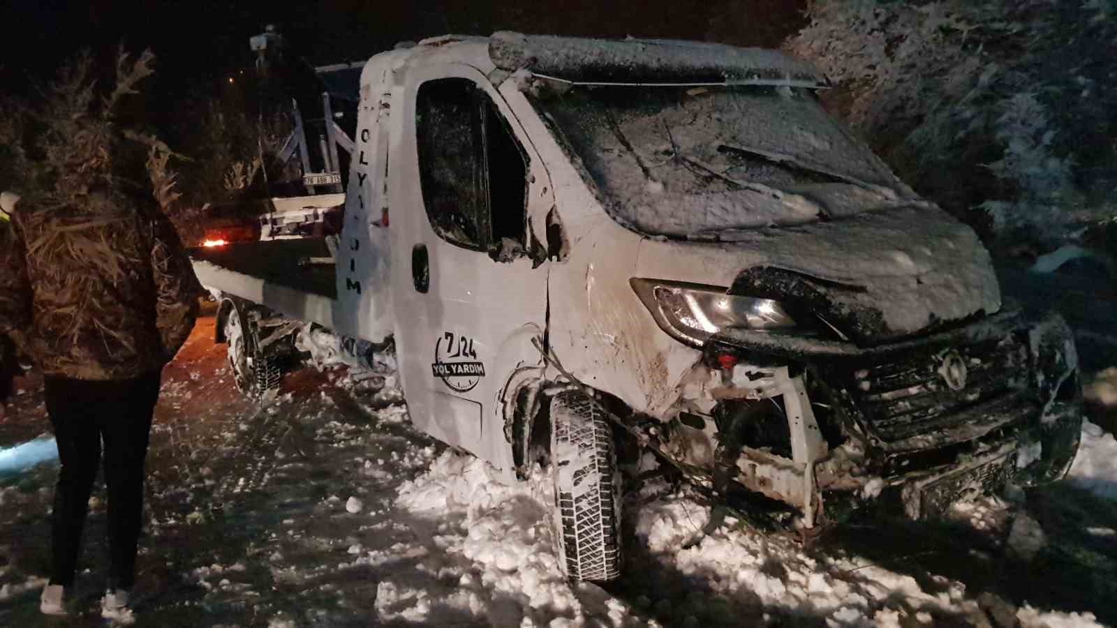 Plakası öğrenilemeyen çekici, kar nedeniyle yolda kalan bir otomobili kurtarmaya giderken sürücüsünün kontrolünden çıkarak şarampole yuvarlandı. Yaklaşık 7 metre yükseklikten yuvarlanan aracın sürücüsü şans eseri kazayı yara almadan atlattı. Araç vinç yardımıyla olay yerinden kaldırıldı. Bölgeye sevk edilen polis ekipleri sürücülere sık sık mesafe ve zincir uyarılarında bulunuyor.
