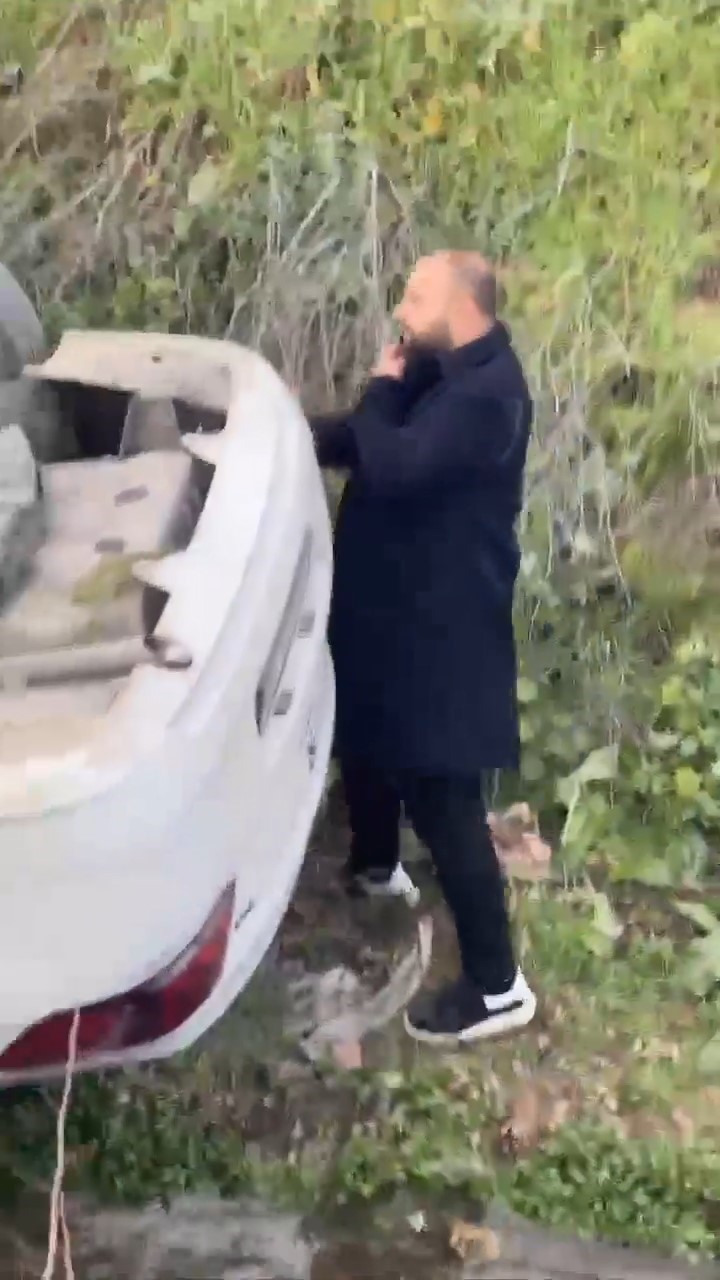 Bursa’da bir otomobil sürücüsü aracıyla dere yatağına uçtu. Ters dönen otomobilden çıkan sürücü o anları "hiçbir şey yokmuş" gibi telefonda anlatırken, arkadaşı o anları gülerek kayda aldı.