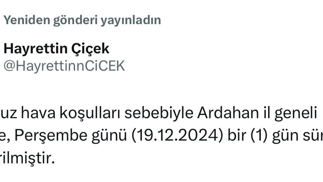 Ardahan Valisi Hayrettin Çiçek, sosyal medya hesabından yaptığı açıklamada, kentte yoğun kar yağışı ve tipinin ulaşımı aksattığını bildirdi. Çiçek, paylaşımında, "Olumsuz hava koşulları sebebiyle Ardahan il geneli eğitime, perşembe günü 1 gün süreyle ara verilmiştir" dedi.