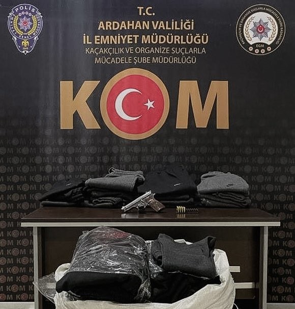 Ardahan İl Emniyet Müdürlüğü Kaçakçılık ve Organize Suçlarla Mücadele Şubesi ekipleri, Posof ilçesinde kaçakçılık faaliyetlerini önlemek amacıyla çalışma yürüttü. Gözaltına alınan şüphelilerin adres ve araçlarında yapılan aramada, 80 tekstil ürünü, bir ruhsatsız tabanca, bir şarjör ve 18 fişek ele geçirildi.