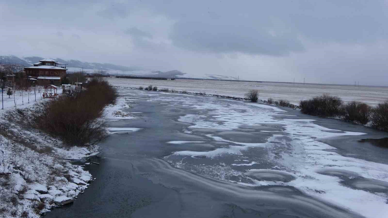 Ardahan’da etkili olan kar yağışının ardından kent merkezinden geçerek, Gürcistan ve Azerbaycan üzerinden Hazar Denizi’ne dökülen Kura Nehri’nin yüzeyi buz tuttu.