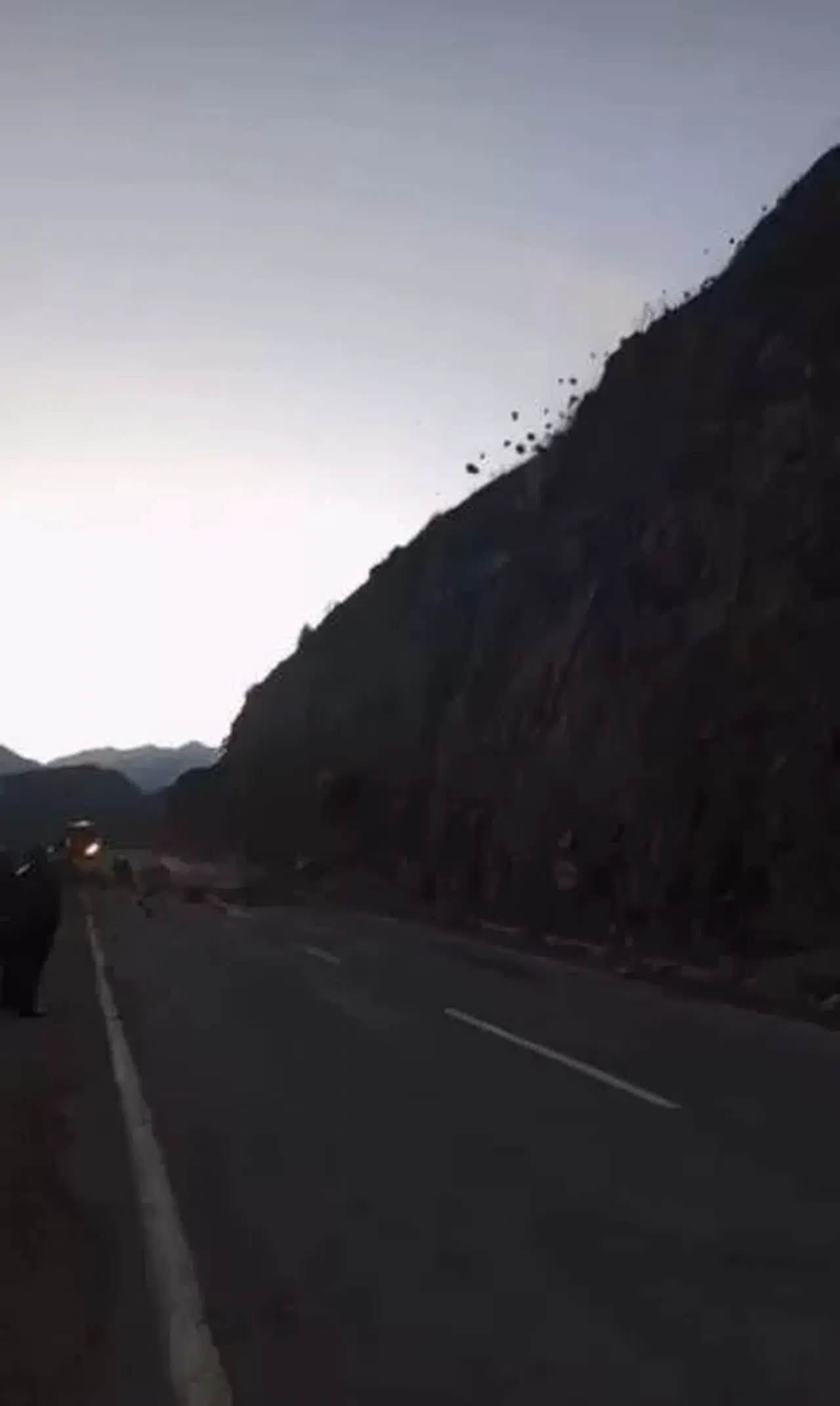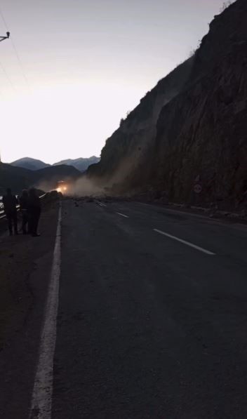 Artvin-Ardahan devlet karayolunda heyelan meydana geldi. Yamaçtan kopan toprak ve kaya parçaları karayolunu ulaşıma kapattı. Heyelan anı cep telefonu kamerasına yansıdı.