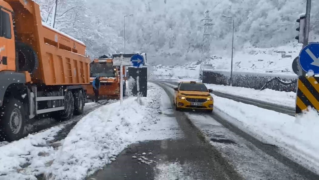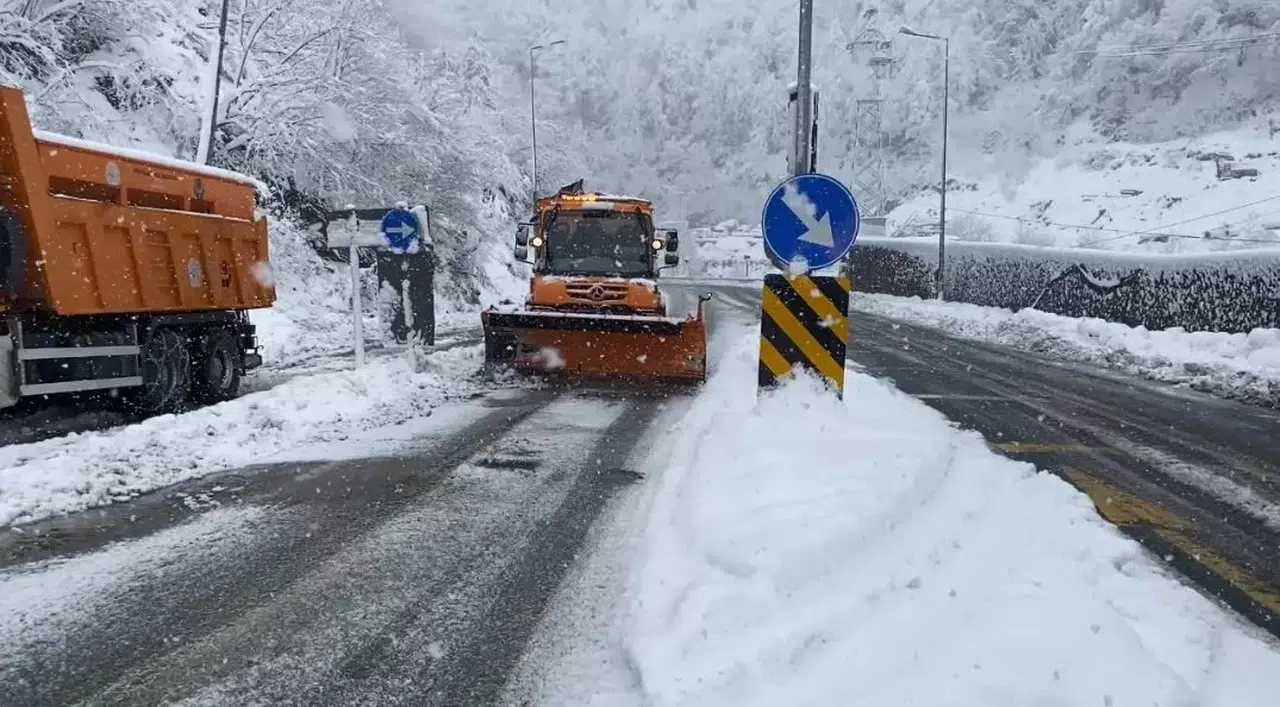 Hopa karayolunda kar nedeniyle trafikte aksamalar yaşansa da ekiplerin müdahalesiyle kontrollü geçişler devam ediyor.