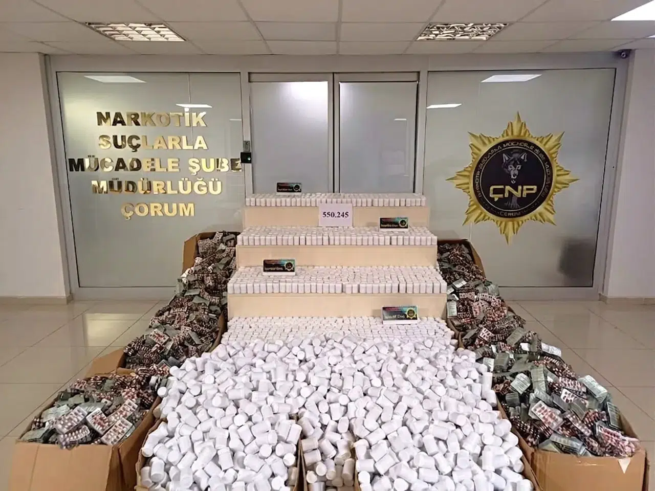 Çorum'un Osmancık ilçesinde polis ekipleri tarafından yüklü miktarda uyuşturucu taşıdığı tespit edilerek durdurulan bir çekicide yapılan aramada 550 bin 245 adet sentetik ecza ele geçirilirken olayla ilgili gözaltına alınan iki şüpheli tutuklanarak cezaevine gönderildi.
