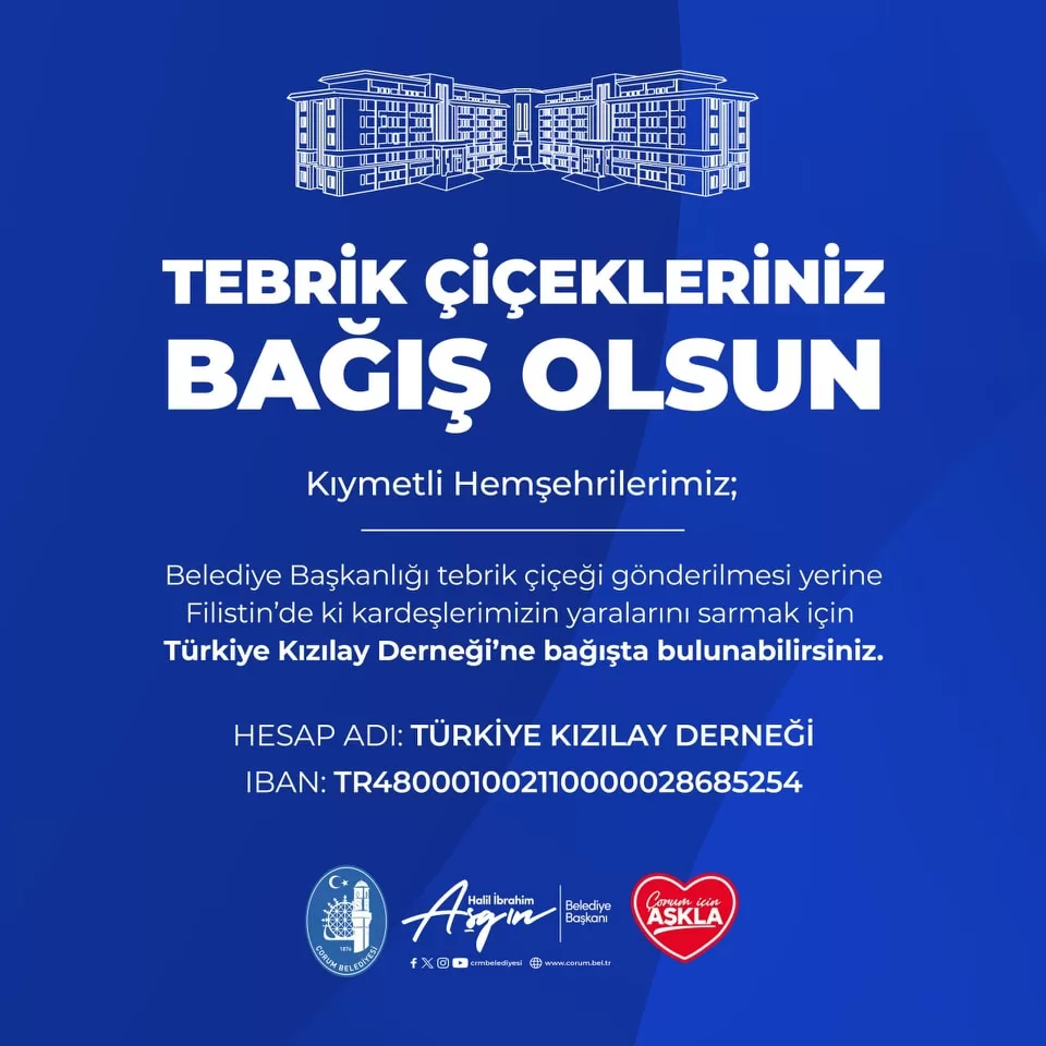 Çorum Belediye Başkanı Halil İbrahim Aşgın, tekrar göreve seçilmesinin ardından tebrik çiçeği yollamak isteyen Çorumlulara bağış yapın ricasında bulundu.