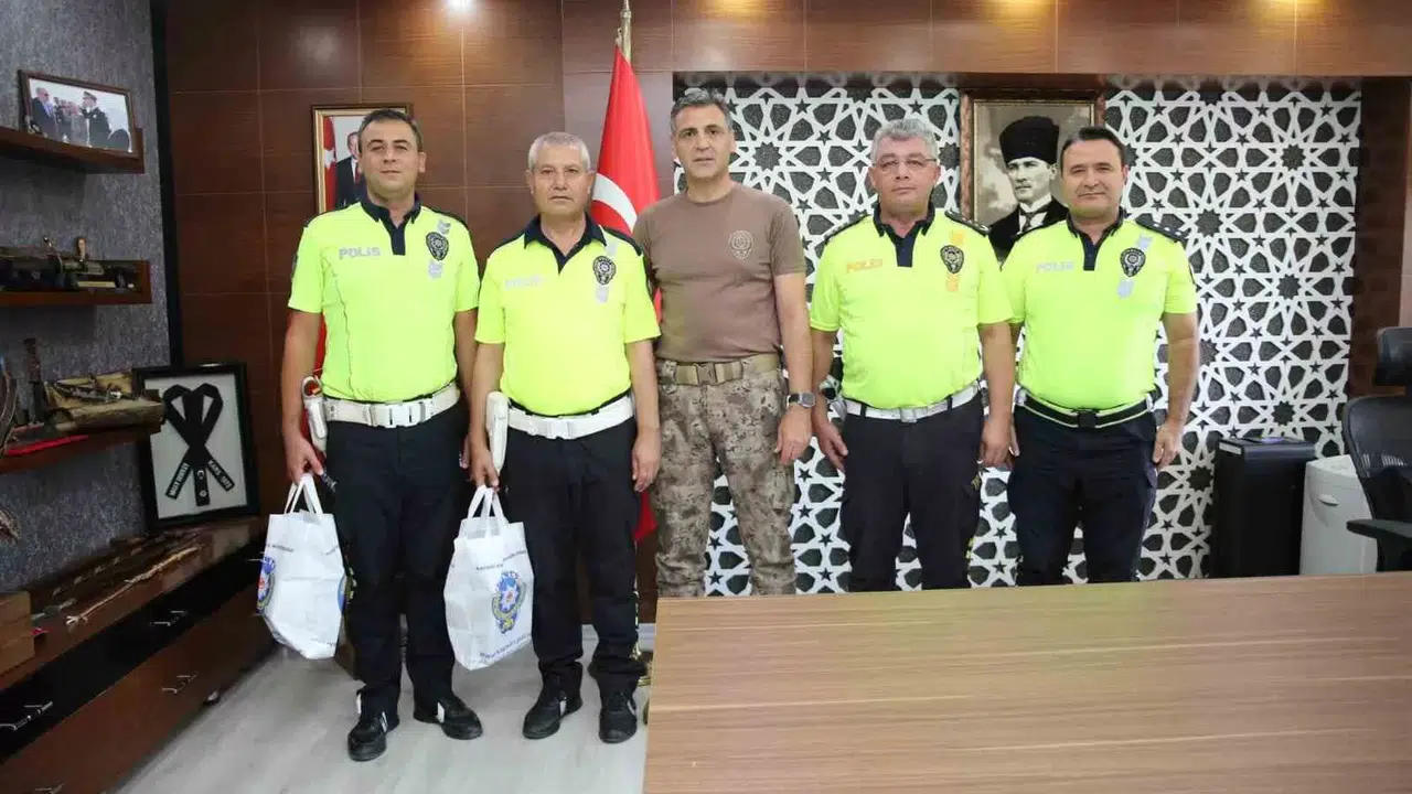 İl Emniyet Müdürü Atanur Aydın da, aracı yolda kalan kadın sürücü ve çocuğuna yardım eden 2 trafik polisini makamında ağırladı. Polislere teşekkür eden Aydın; çeşitli hediyeler vererek başarılı ve özverili çalışmalarından dolayı kendilerini tebrik etti.
