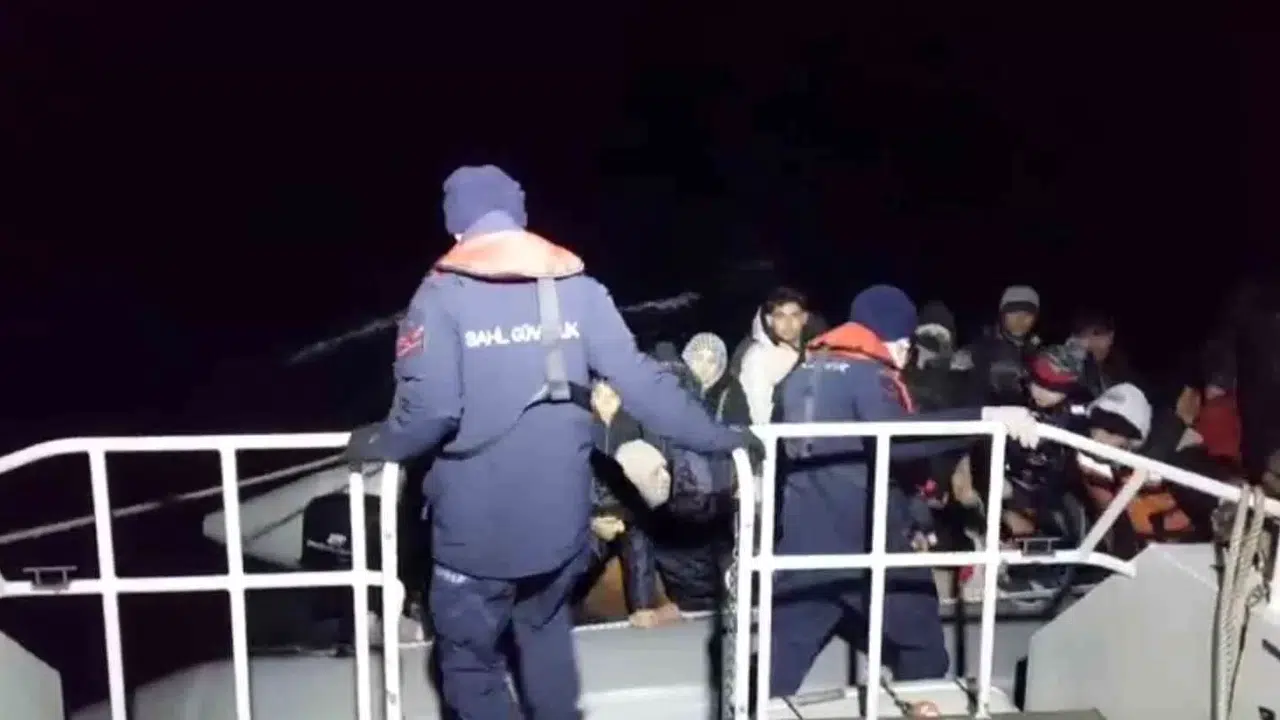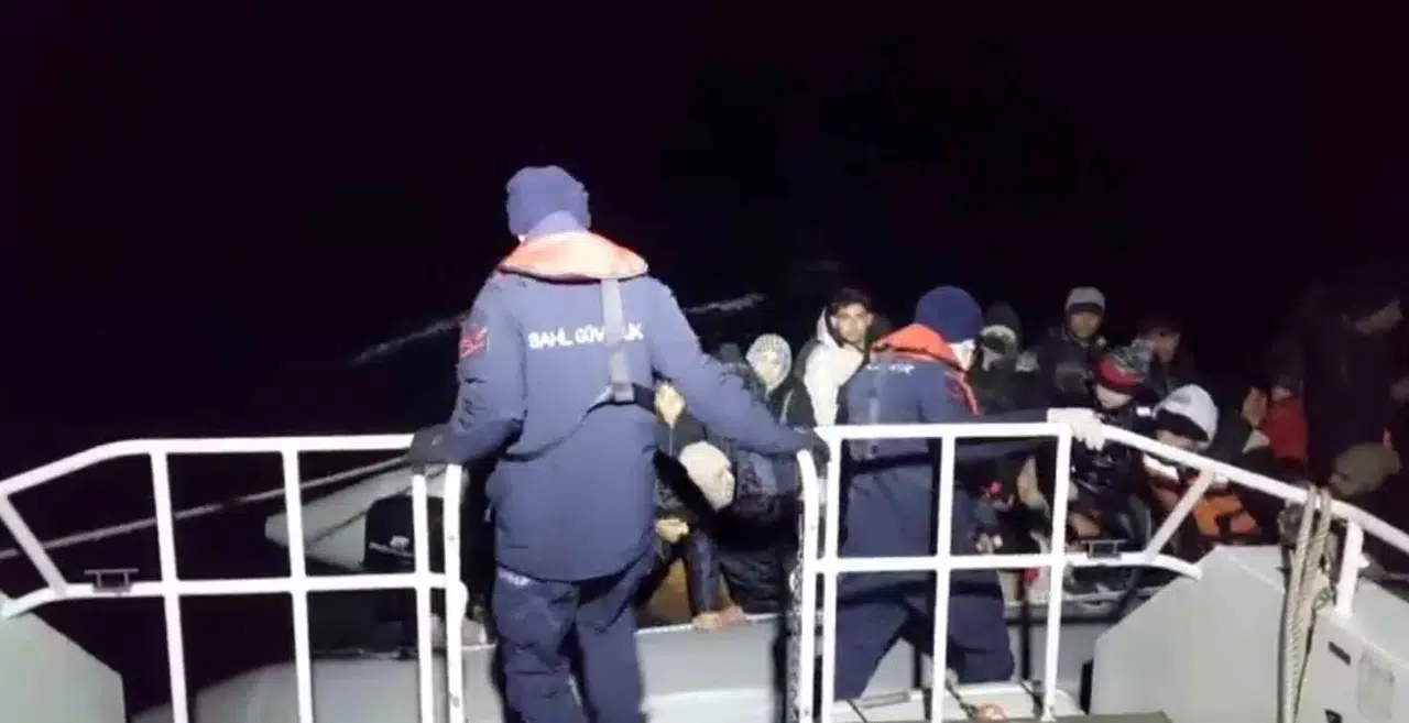Balıkesir’in Ayvalık ilçesi açıklarında Yunanistan’a yasa dışı yollardan geçmeye çalışırken motoru bozulan lastik botta sürüklenen 27’si çocuk 54 düzensiz göçmen Sahil Güvenlik tarafından kurtarıldı.