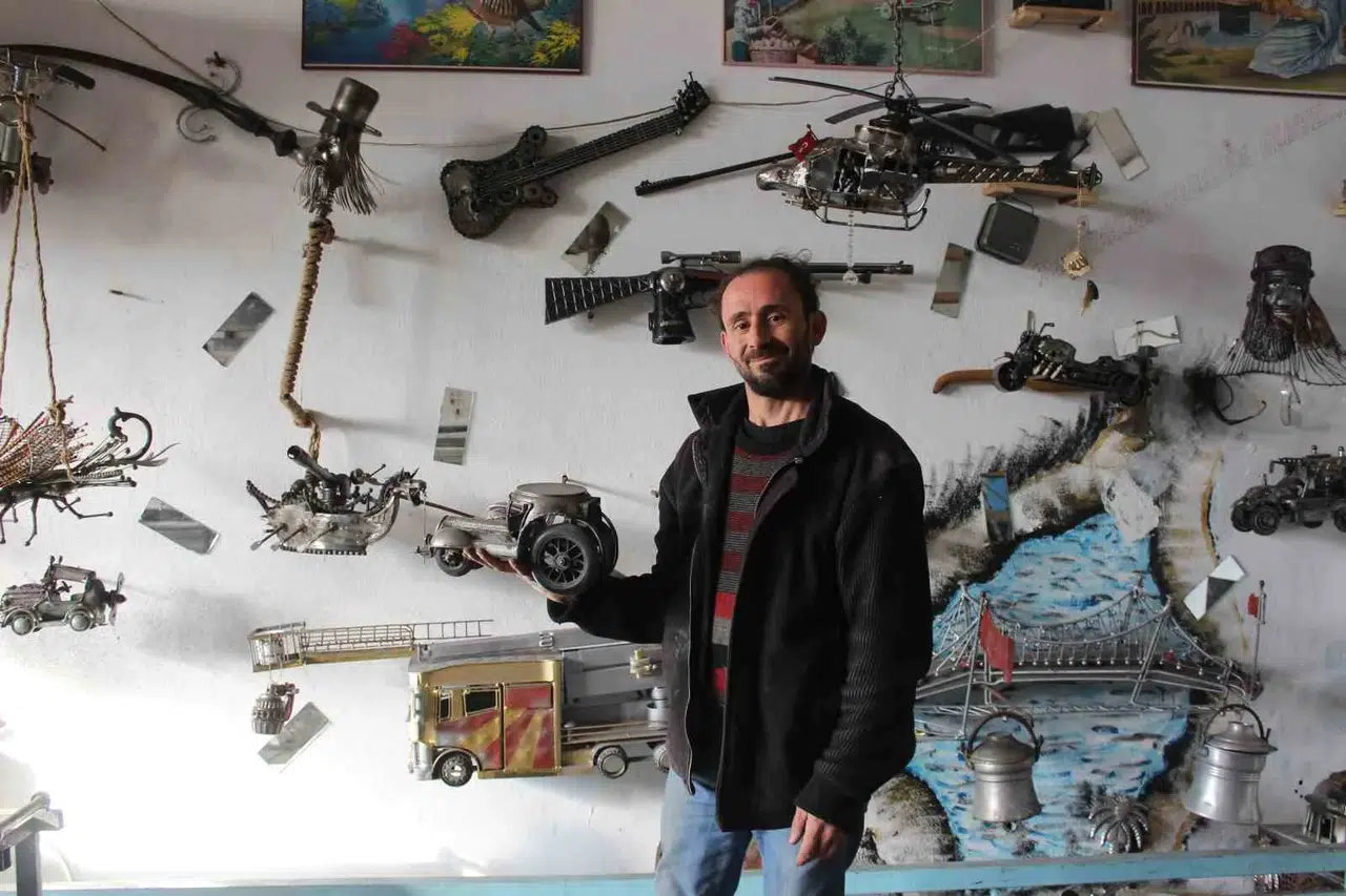 Sivas’ın Suşehri ilçesi sanayi sitesinde demir doğrama işiyle uğraşan Mehmet Çataltas (40) adeta mesleğini konuşturuyor. Küçükken babasının kendisine oyuncak alamaması üzerine kendi oyuncaklarını yapmaya karar veren Çataltaş, demir parçalarından yaptığı dikkat çekici ürünlerle adından söz ettiriyor. Çataltaş, sıradan malzemeleri kimi zaman günlerce kimi zaman aylarca çaba sarf ederek sıra dışı eserlere dönüştürüyor. Ütüden korsan gemisi, yangın tüpünden otomobil, avizeden sinek ve dikiş makinesinden silah yapan usta, görenleri kendine hayran bırakıyor.