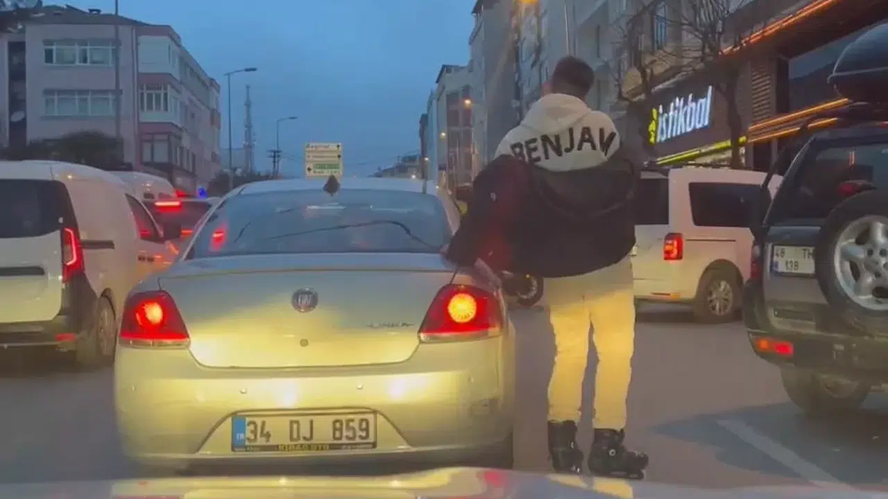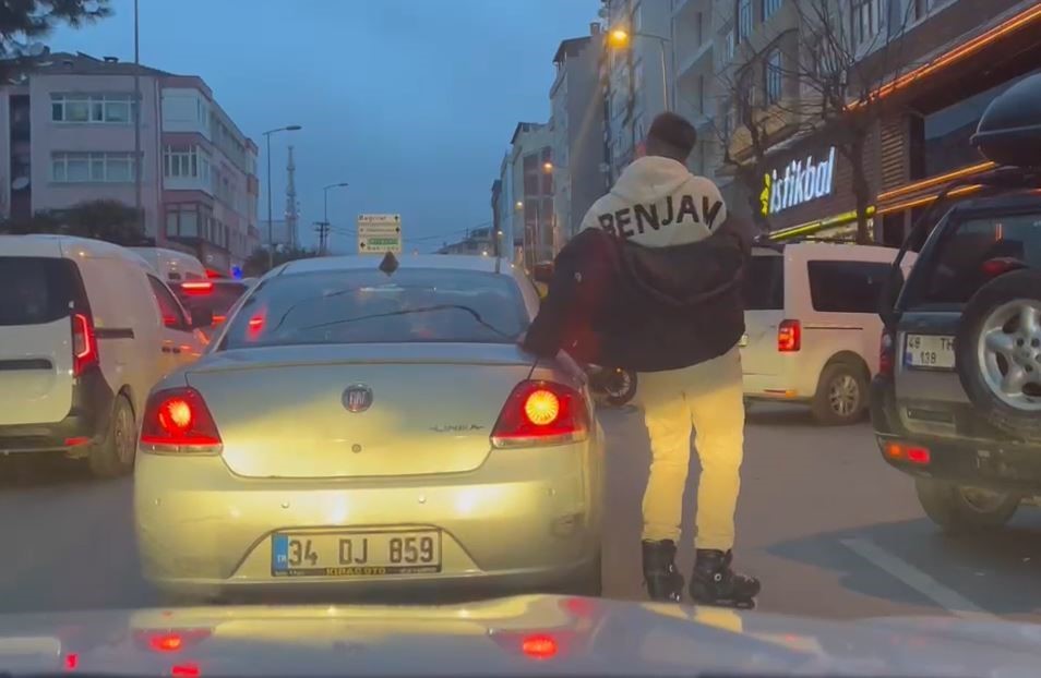 Bahçelievler’de patenli genç trafikte seyir halindeki araca tutunarak telefonla konuşarak ilerledi. Yürekleri ağza getiren tehlikeli yolculuğu kameraya yansıdı.