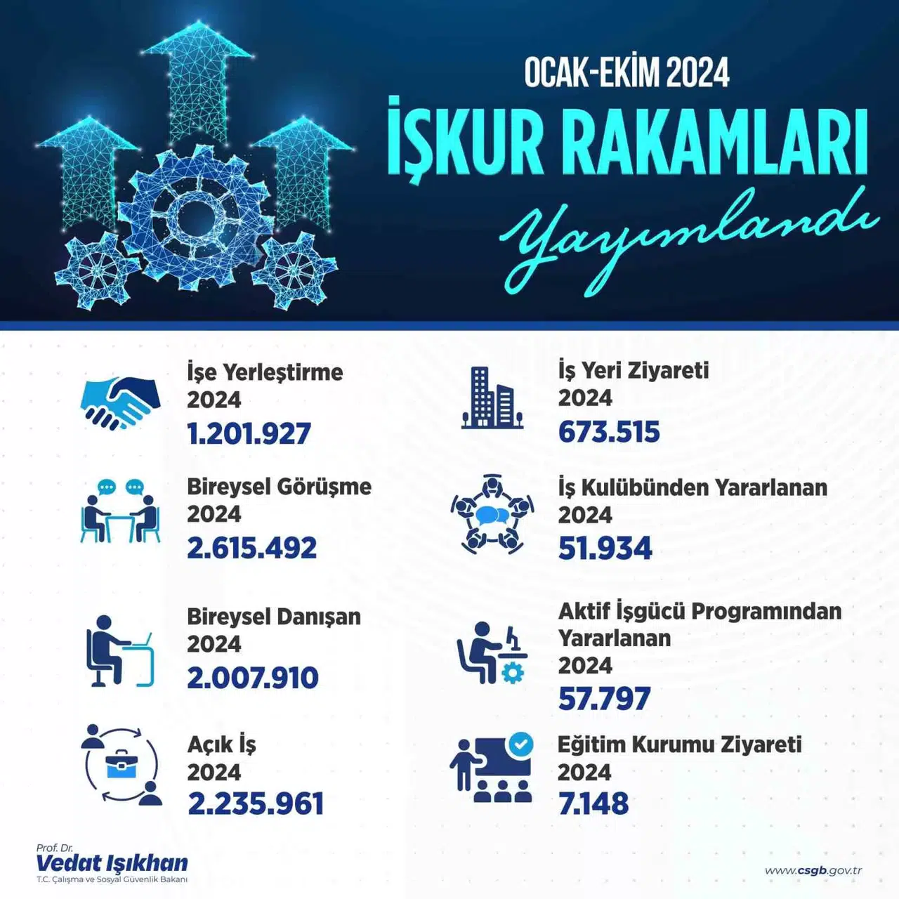 “2024 yılı Ocak-Ekim ayları arasında 1 milyon 201 bin 927 vatandaşımızın işe yerleştirilmesine aracılık ettik. İş ve meslek danışmanlığı hizmetlerimiz kapsamında 2 milyon 615 bin 492 bireysel görüşme gerçekleştirdik. Kamu istihdam kurumumuz İŞKUR aracılığıyla iş arayan vatandaşlarımızın ve işverenlerimizin yanında olmaya devam edeceğiz.”