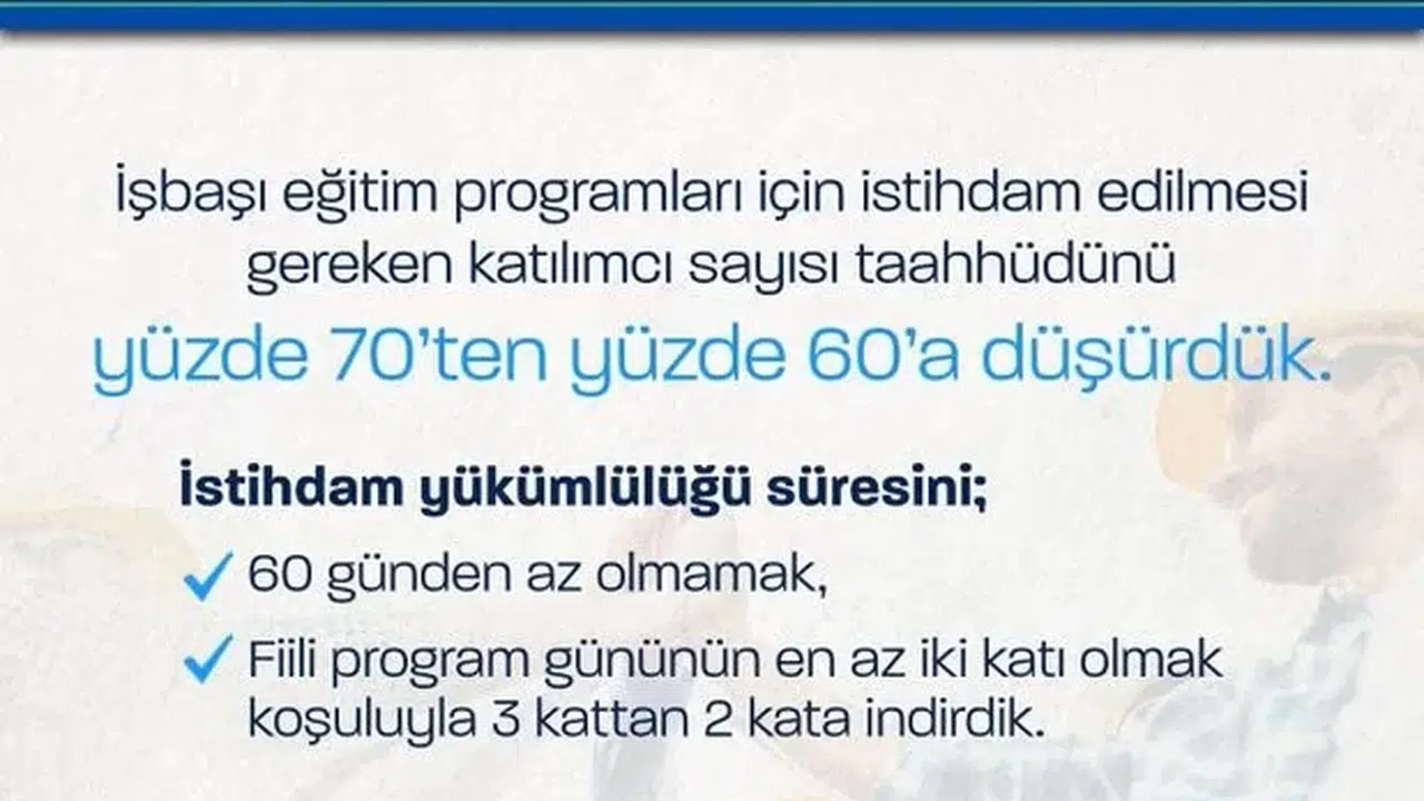 "İşbaşı Eğitim Programı"nda yeni bir düzenlemeyi hayata geçiriyoruz. İşbaşı eğitim programları için istihdam edilmesi gereken katılımcı sayısı taahhüdünü yüzde 70’ten yüzde 60’a, istihdam yükümlülüğünü 3 kattan 2 kata düşürerek iş arayan vatandaşlarımızın ve işverenlerimizin bu programlardan daha fazla yararlanmasının önünü açıyoruz. Ayrıca uygulanmakta olan sektör kısıtlamasını kaldırarak hizmetlerimizin yaygınlaşmasını sağlıyoruz.
