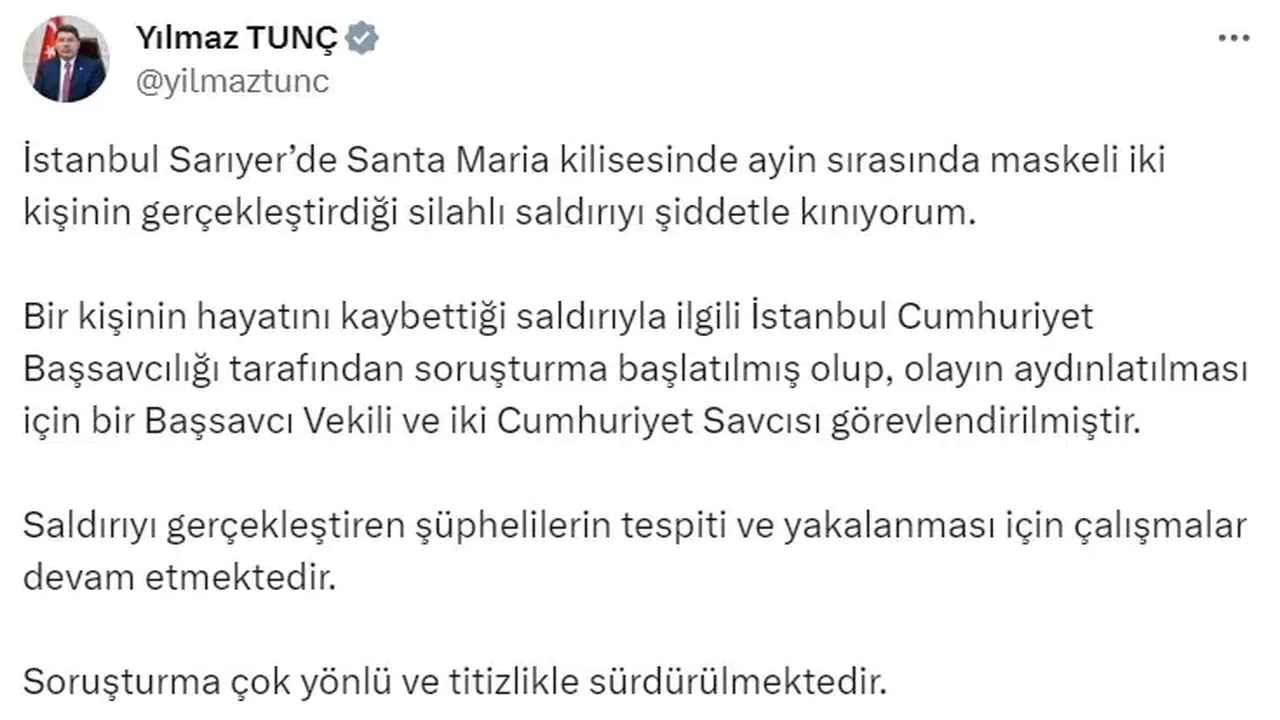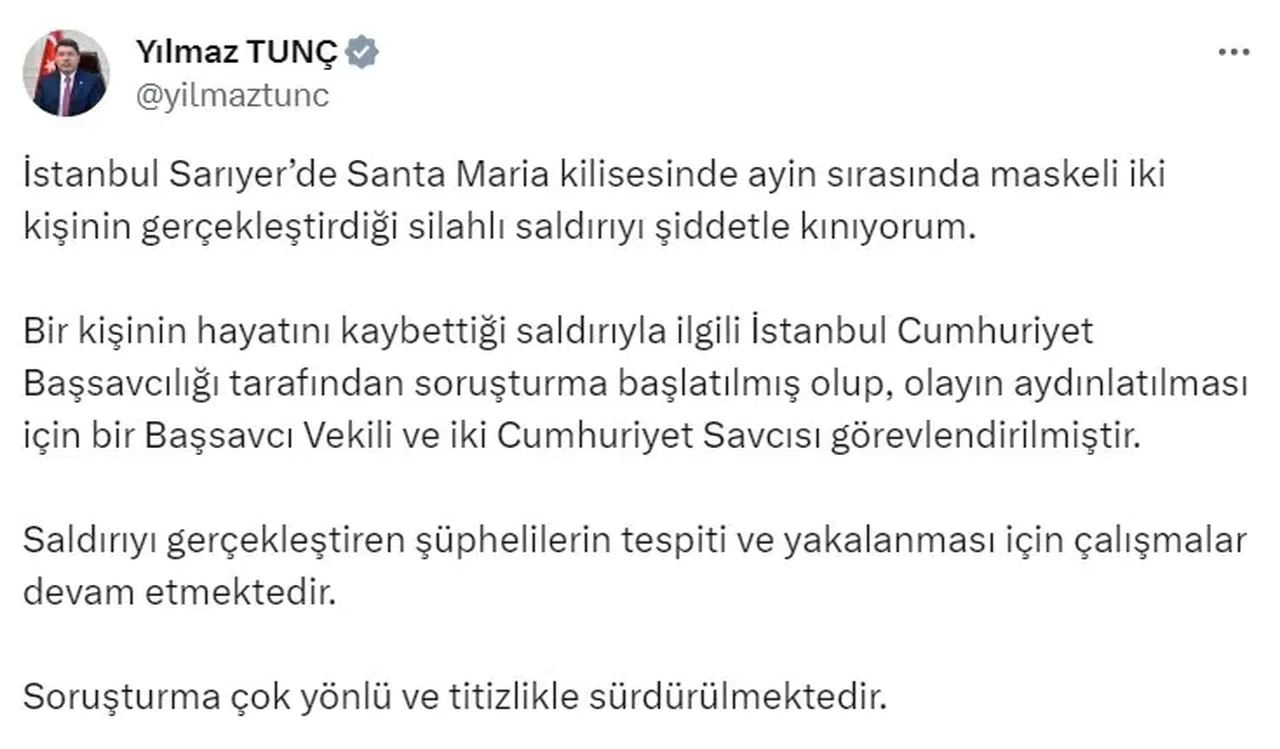Bakan Tunç, Santa Maria Kilisesi’ndeki saldırıya ilişkin sosyal medya hesabından açıklamalarda bulundu. Açıklamasında saldırıyı şiddetle kınadığını bildiren Tunç, "İstanbul Sarıyer’de Santa Maria Kilisesi’nde ayin sırasında maskeli iki kişinin gerçekleştirdiği silahlı saldırıyı şiddetle kınıyorum. Bir kişinin hayatını kaybettiği saldırıyla ilgili İstanbul Cumhuriyet Başsavcılığı tarafından soruşturma başlatılmış olup, olayın aydınlatılması için bir başsavcı vekili ve iki cumhuriyet savcısı görevlendirilmiştir. Saldırıyı gerçekleştiren şüphelilerin tespiti ve yakalanması için çalışmalar devam etmektedir. Soruşturma çok yönlü ve titizlikle sürdürülmektedir" ifadelerini kullandı.