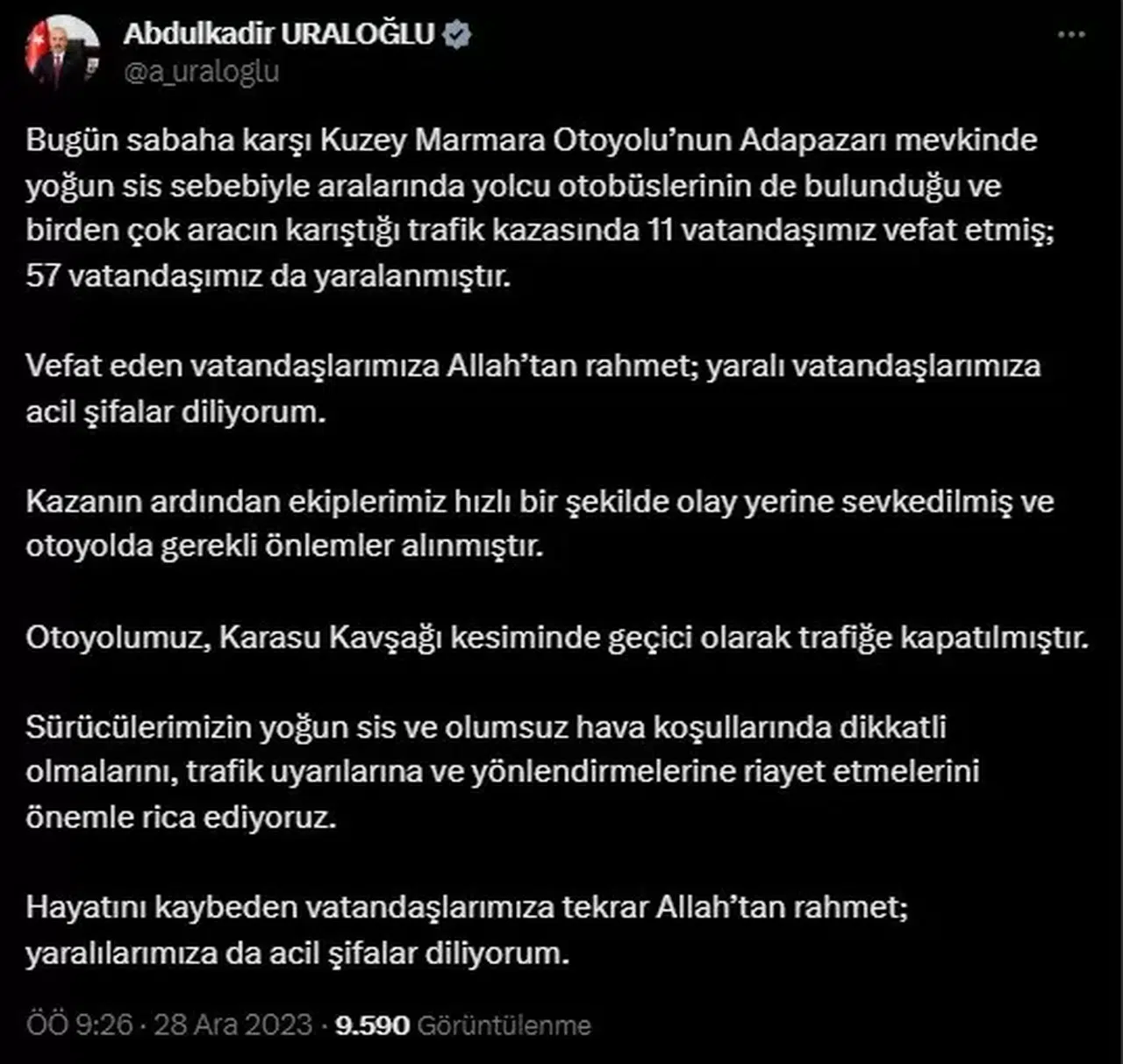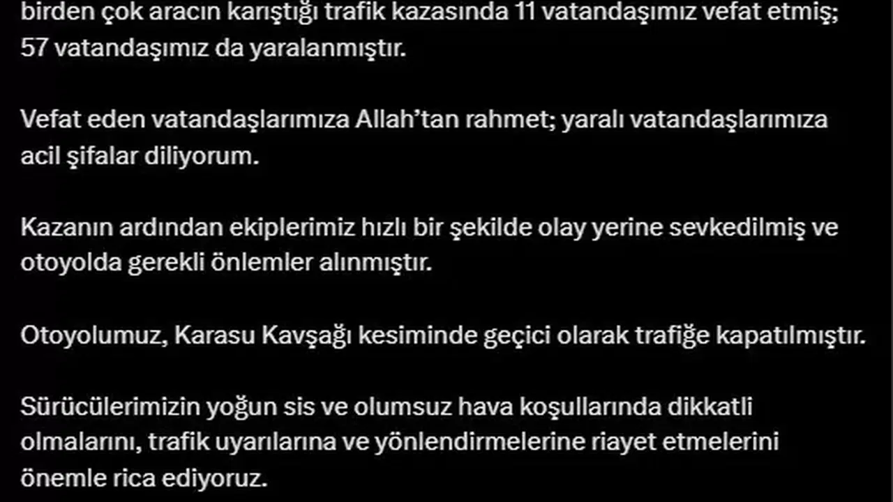 Ulaştırma ve Altyapı Bakanı Abdulkadir Uraloğlu, bugün sabaha karşı Kuzey Marmara Otoyolu’nda meydana gelen zincirleme trafik kazası hakkında resmi sosyal medya hesaplarından açıklama yaptı. Uraloğlu paylaşımında, “Bugün sabaha karşı Kuzey Marmara Otoyolu’nun Adapazarı mevkiinde yoğun sis sebebiyle aralarında yolcu otobüslerinin de bulunduğu ve birden çok aracın karıştığı trafik kazasında 11 vatandaşımız vefat etmiş, 57 vatandaşımız da yaralanmıştır” dedi.