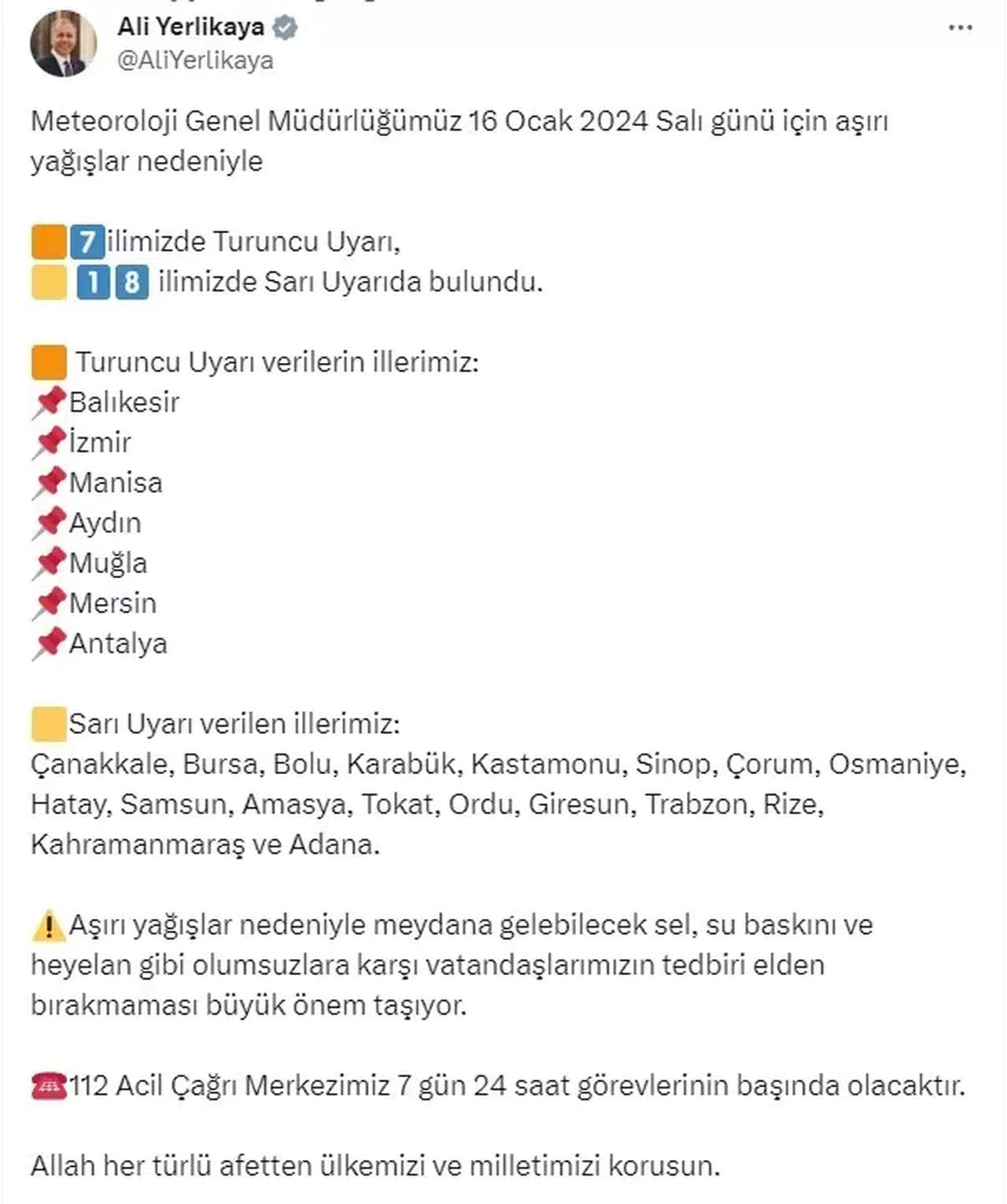 “Aşırı yağışlar nedeniyle meydana gelebilecek sel, su baskını ve heyelan gibi olumsuzlara karşı vatandaşlarımızın tedbiri elden bırakmaması büyük önem taşıyor. 112 Acil Çağrı Merkezimiz 7 gün 24 saat görevlerinin başında olacaktır. Allah her türlü afetten ülkemizi ve milletimizi korusun.”