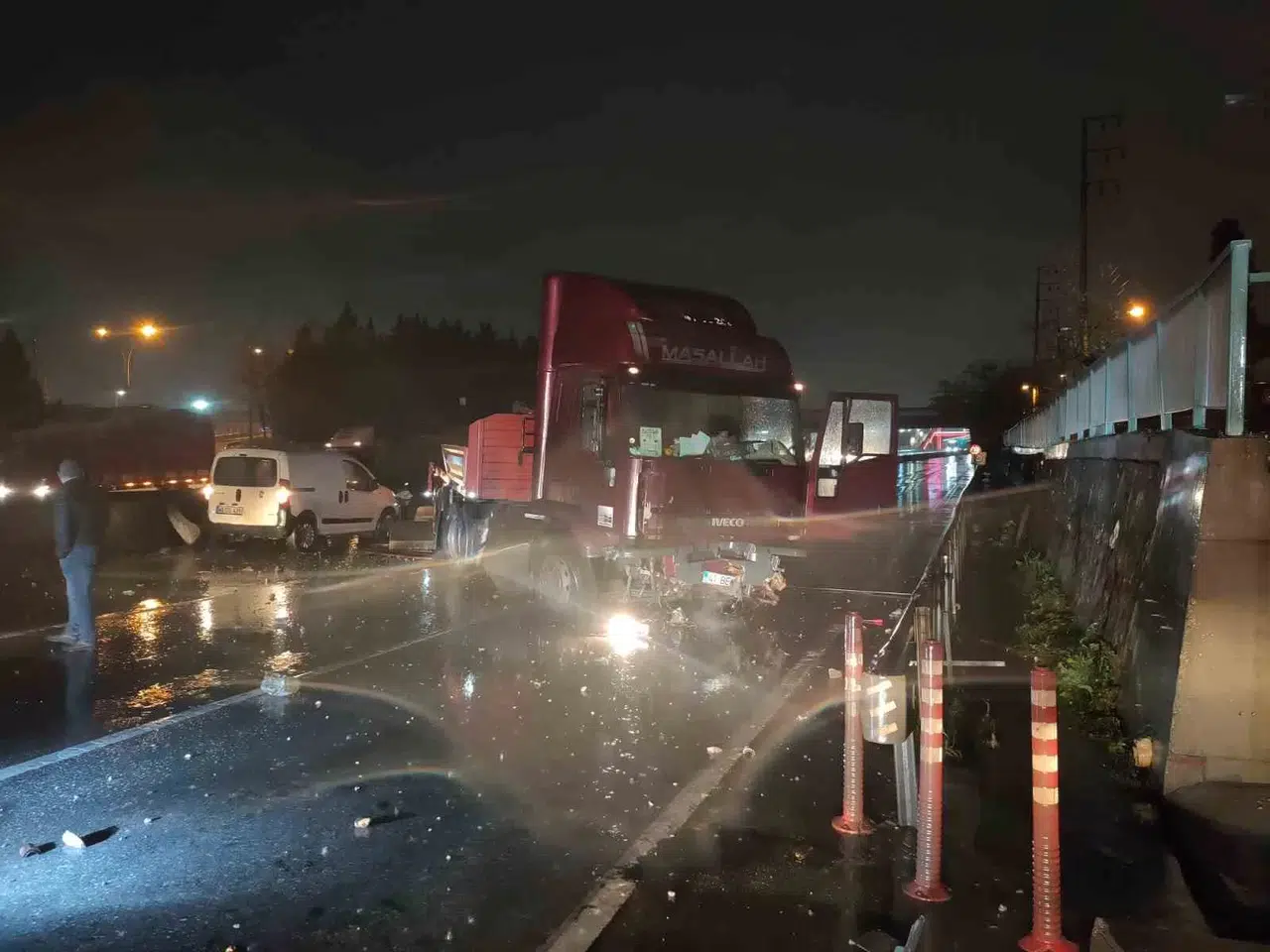 Kocaeli D100 Karayolunda seyir halinde olan tır, bariyerleri aşarak karşı şeride geçti. Meydana gelen kaza sebebiyle trafik durma noktasına geldi.