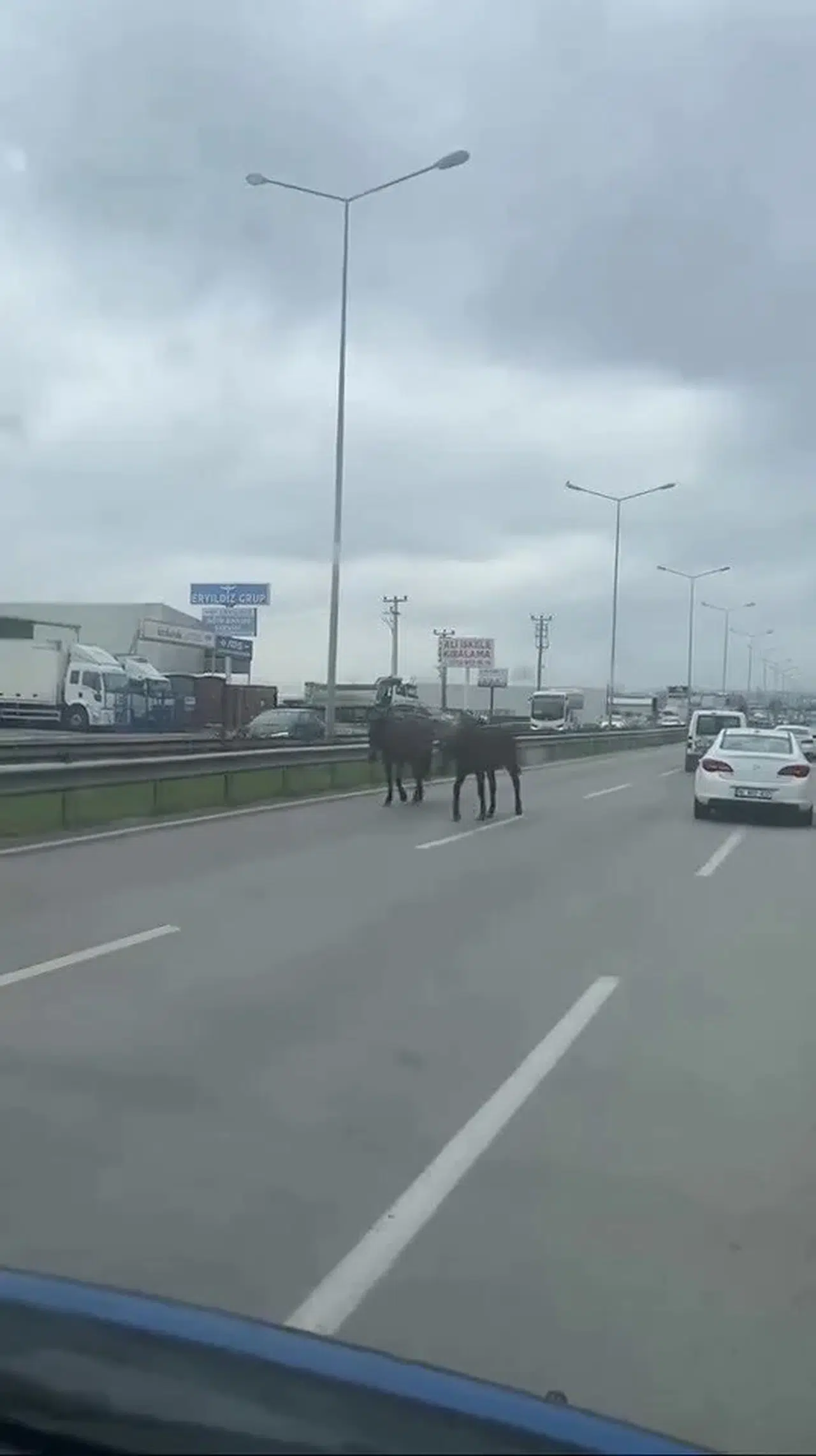 Bursa’da başıboş atlar, ana yolu esir alarak hipodroma çevirdi. Sürücülerin zor anları kameraya yansıdı.