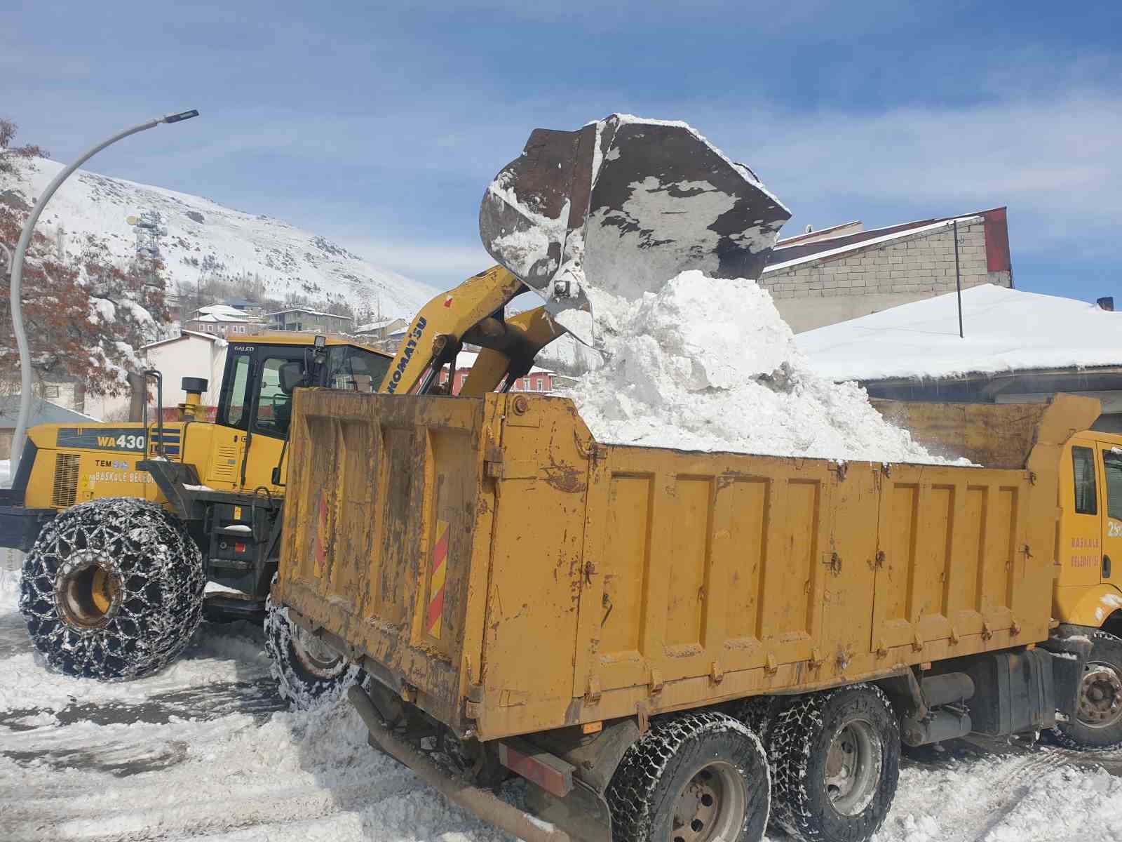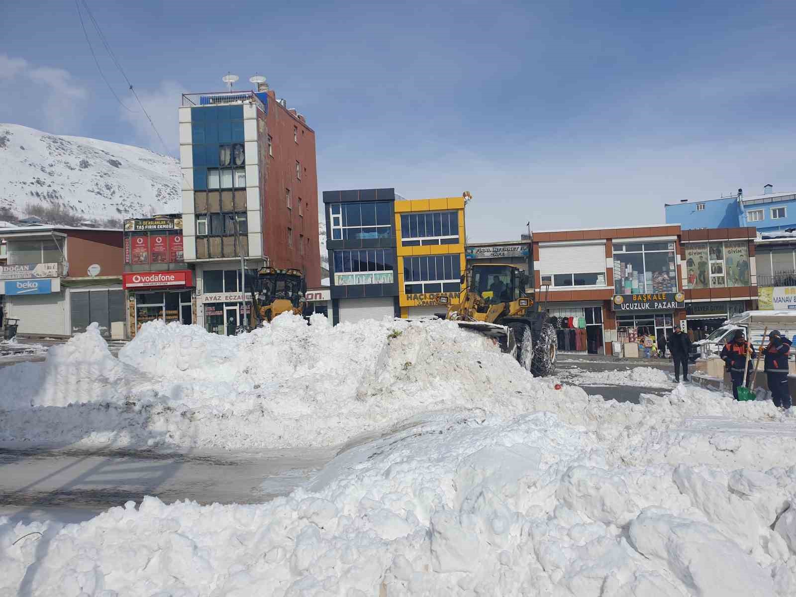 Van’ın Başkale ilçesinde bir metreyi geçen kar kalınlığının ardından başlatılan çalışmalar sonucunda iş makineleriyle toplanan kar yığınları kamyonlarla yerleşim yerinin dışına taşınıyor.