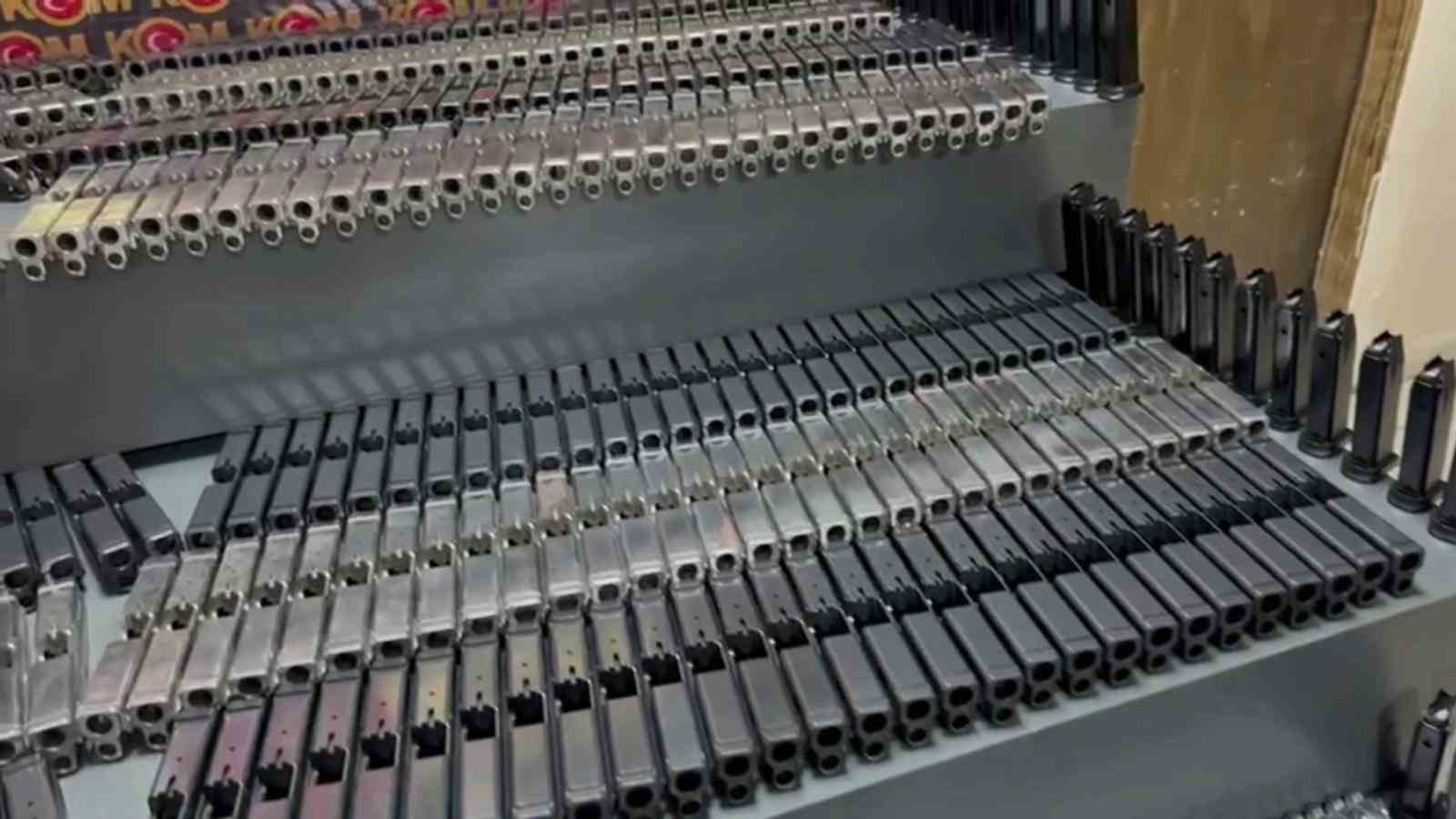 Batman İl Emniyet Müdürlüğü Kaçakçılık ve Organize Suçlarla Mücadele Şube Müdürlüğü ekipleri tarafından belirlenen bir eve operasyon düzenlendi. Duvardaki farklı yeri balyozla kıran ekipler, 3 bin 540 adet siyah renkli şarjör, bin 640 adet siyah renkli sürgü kapağı, 840 adet gri renkli sürgü kapağı, bin 20 adet siyah renkli namlu, 600 adet gri renkli namlu, 750 adet tek dişli tetik, 2 bin 700 adet çift dişli tetik, 550 adet tetik mekanizması, bin 600 adet horoz mandal yayı, 250 adet sürgü tutucu pim, 650 adet icra mili aparatı, 900 adet icra mili, 3 bin 850 adet tetik mekanizması sabitleyicisi, 500 adet tetik emniyet kilidi, 60 adet icra mili sabitleyicisi, 22 bin 500 adet yay, 12 bin 500 adet sabitleme pimi ve bin 200 adet emniyet mandal pimi ele geçirildi.
