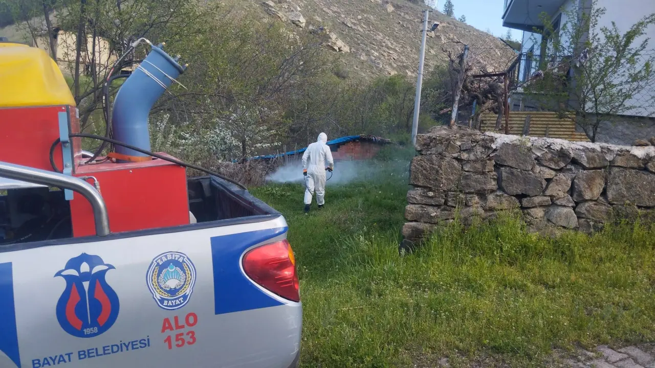 Çorum'un Bayat ilçesinde belediye ekipleri havaların ısınmasıyla birlikte oluşabilecek haşere ve sivrisinek sorunlarının önüne geçmek amacıyla ilçe genelinde kapsamlı larva ilaçlama çalışmalarına başladı.