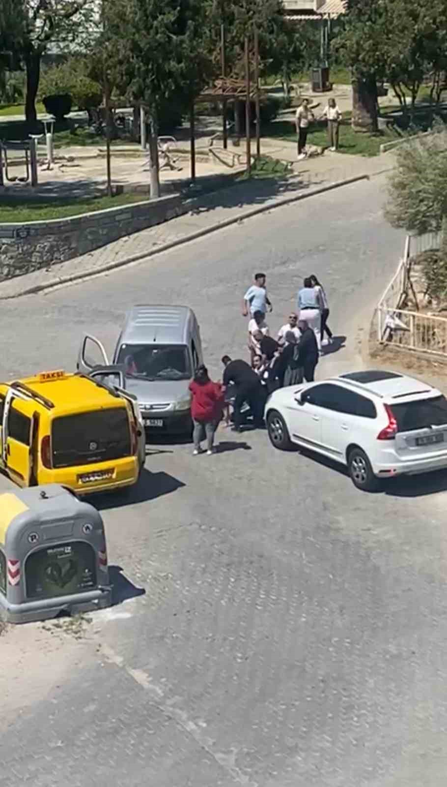 Aydın’ın Kuşadası ilçesi’nde birbirlerine yol vermediği ileri sürülen sürücüler ve yakınları önce tartıştı daha sonra tekme tokat kavga ettiler. Bayramlaşmaya giderken adeta meydan savaşına tutuşan tarafların öfkesi kameralara böyle yansıdı.
