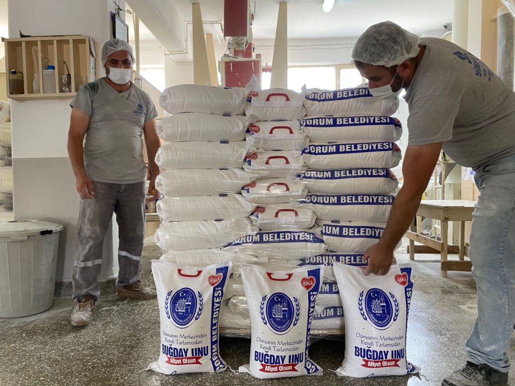Çorum Belediyesi’nin ürettiği buğdaylar una dönüştü. 10’ar kiloluk çuvallar halinde paketlenen toplam 15 ton un, ihtiyaç sahiplerine dağıtılacak.