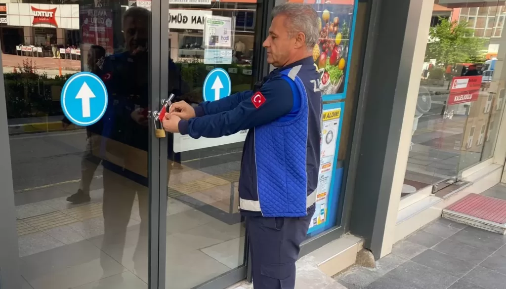 Çorum Belediyesi Zabıta Müdürlüğüne bağlı ekipler yapılan yasal uyarılara rağmen İşyeri Açma ve Çalışma Ruhsat Yönetmeliği’ne aykırı hareket eden bir zincir market şubesini mühürleyerek faaliyetten men etti.