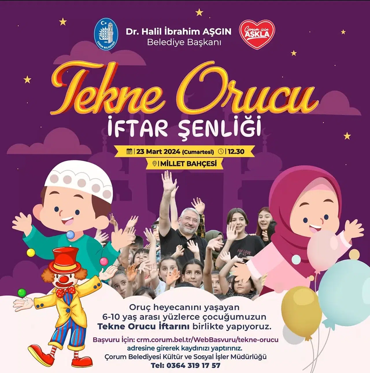 Etkinlike ile ilgili açıklama yapan Çorum Belediyesi “Tekne Orucu İftar Şenliği” için kayıt aldıklarını ve vatandaşların corum.bel.tr/WebBasvuru/tekne-orucu adresine giderek veya 0364 319 17 57 numaralı telefon aranarak kayıt yaptırabileceğini açıkladı.